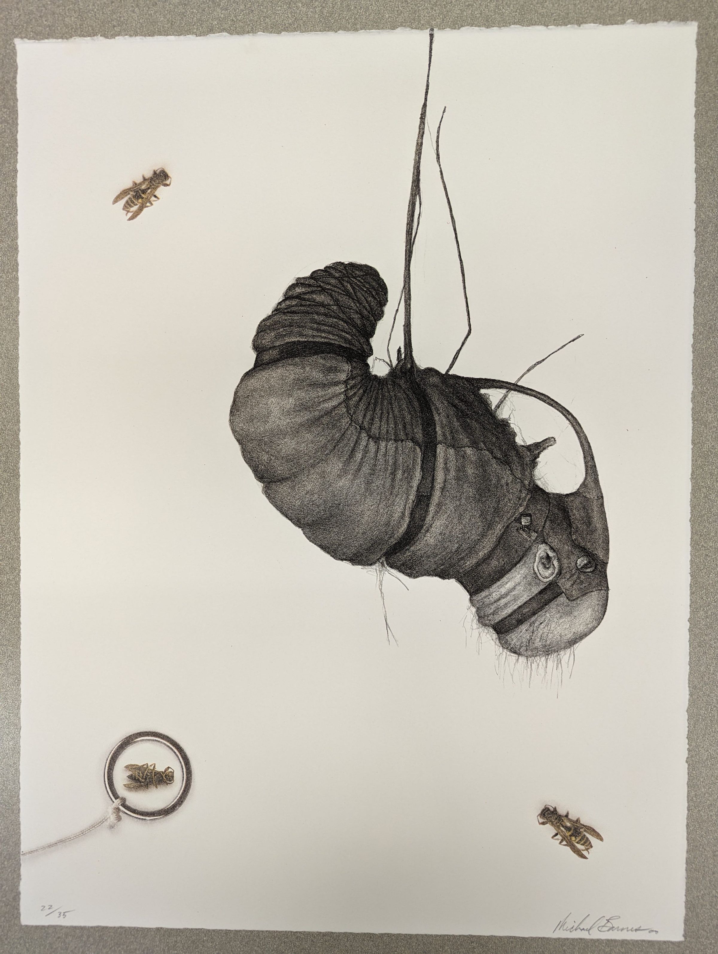 A large lithograph print on deckle edged paper. The primary image is a creature in black and white, resembling a grub with an old man's balding head bound in a face-and-body jacket while hanging upside down. It's surrounded by three dead black and yellow wasps; one of them is upside down, surrounded by a metal ring attached to a string that runs to the edge of the page.Context