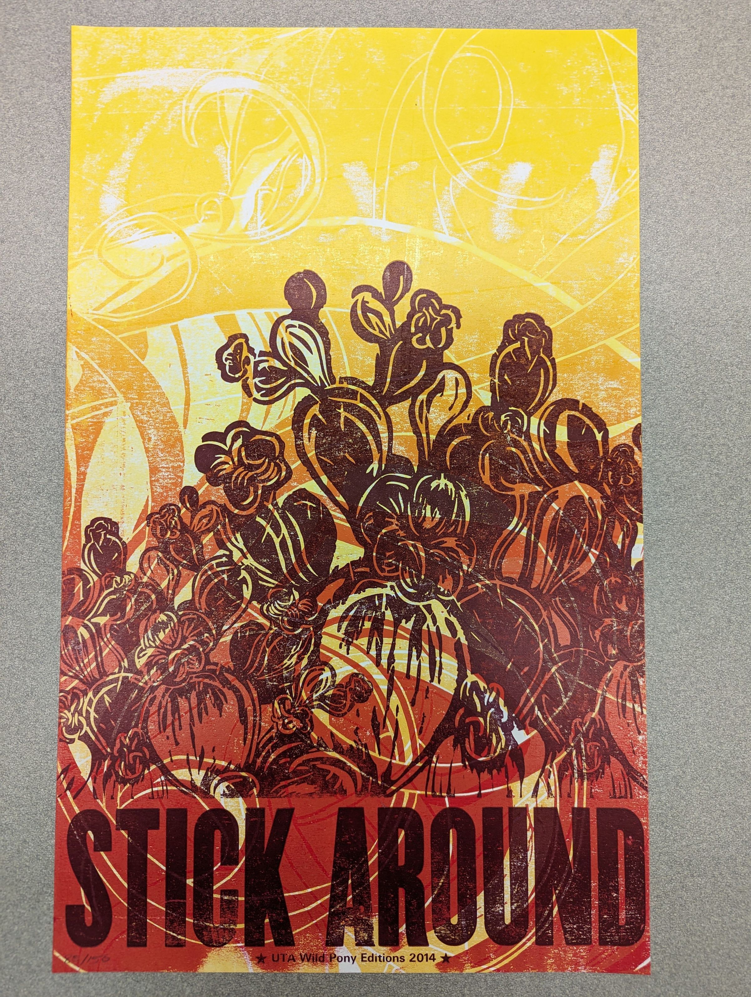 A medium vertically oriented screenprint. The background is a gradient from yellow to range with squiggly arcing designs; printed in the foreground is a dark red stylized image of flowering cacti, under which is printed "STICK AROUND" in bold lettering, with a caption reading "UTA Wild Pony Editions 2014."Context