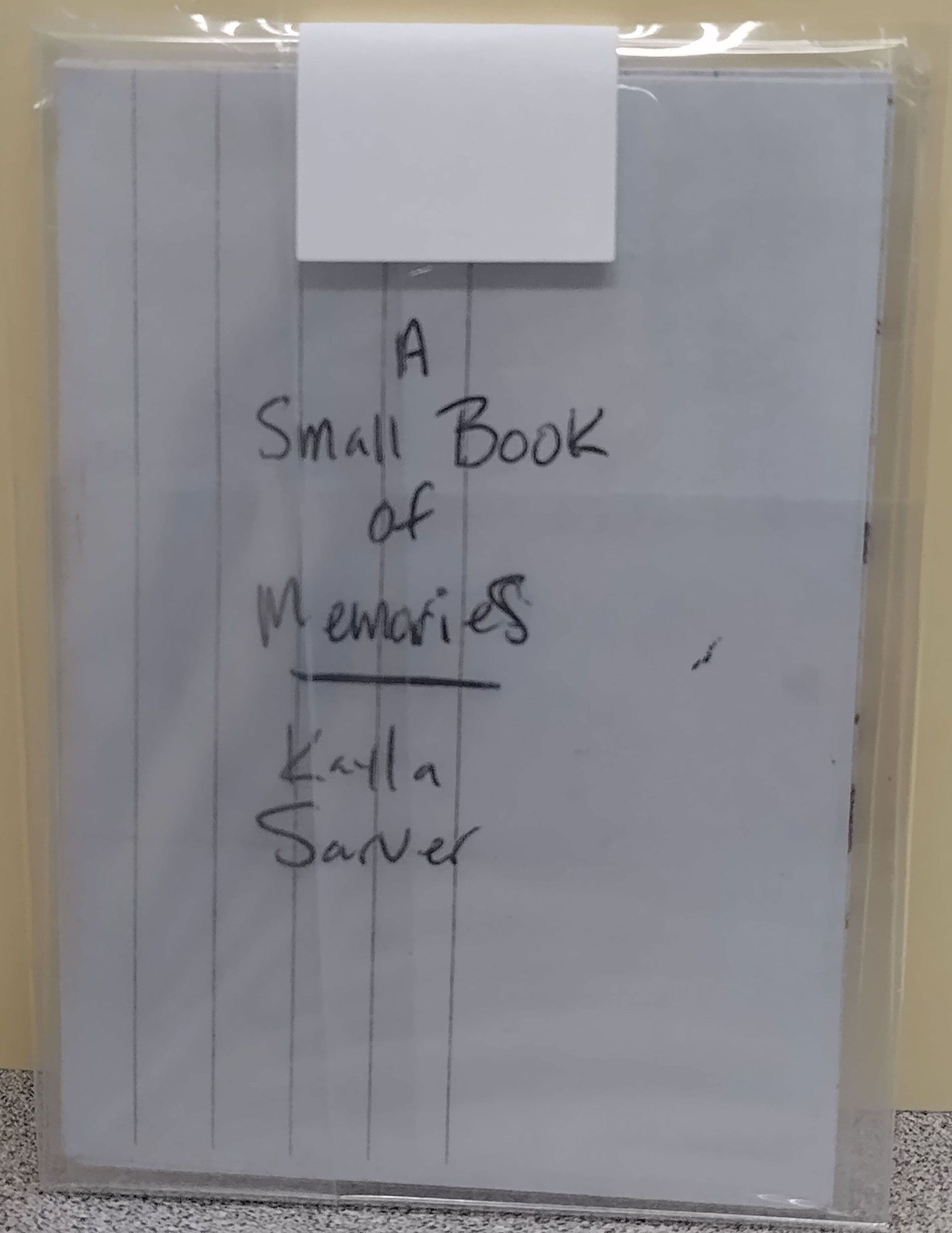 Small black and white copy of lined paper cut and folded with the lines going vertical . The front cover has the title copy printed in the center, written in the artist's hand in pen, followed by a line underneath and the author/artist name written after. The back cover is blank except for the vertical line pattern of lined paper.Collection