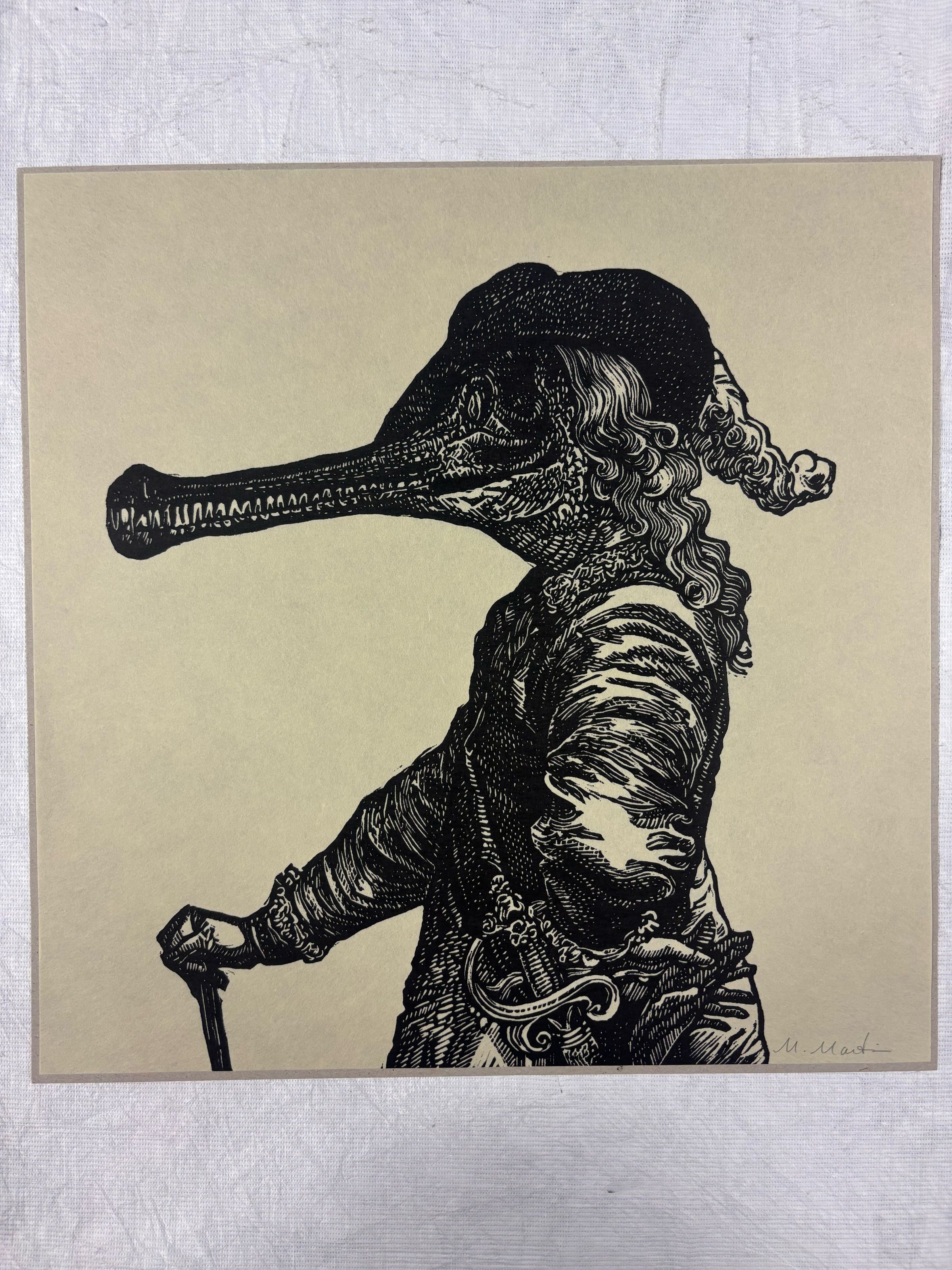 Medium, square print of an alligator in profile view framed from the waist up against beige paper. It is dressed in an 18th century uniform coat with a peruke wig, tricorn hat, and holding a loaded cane with a sword on his belt.Collection