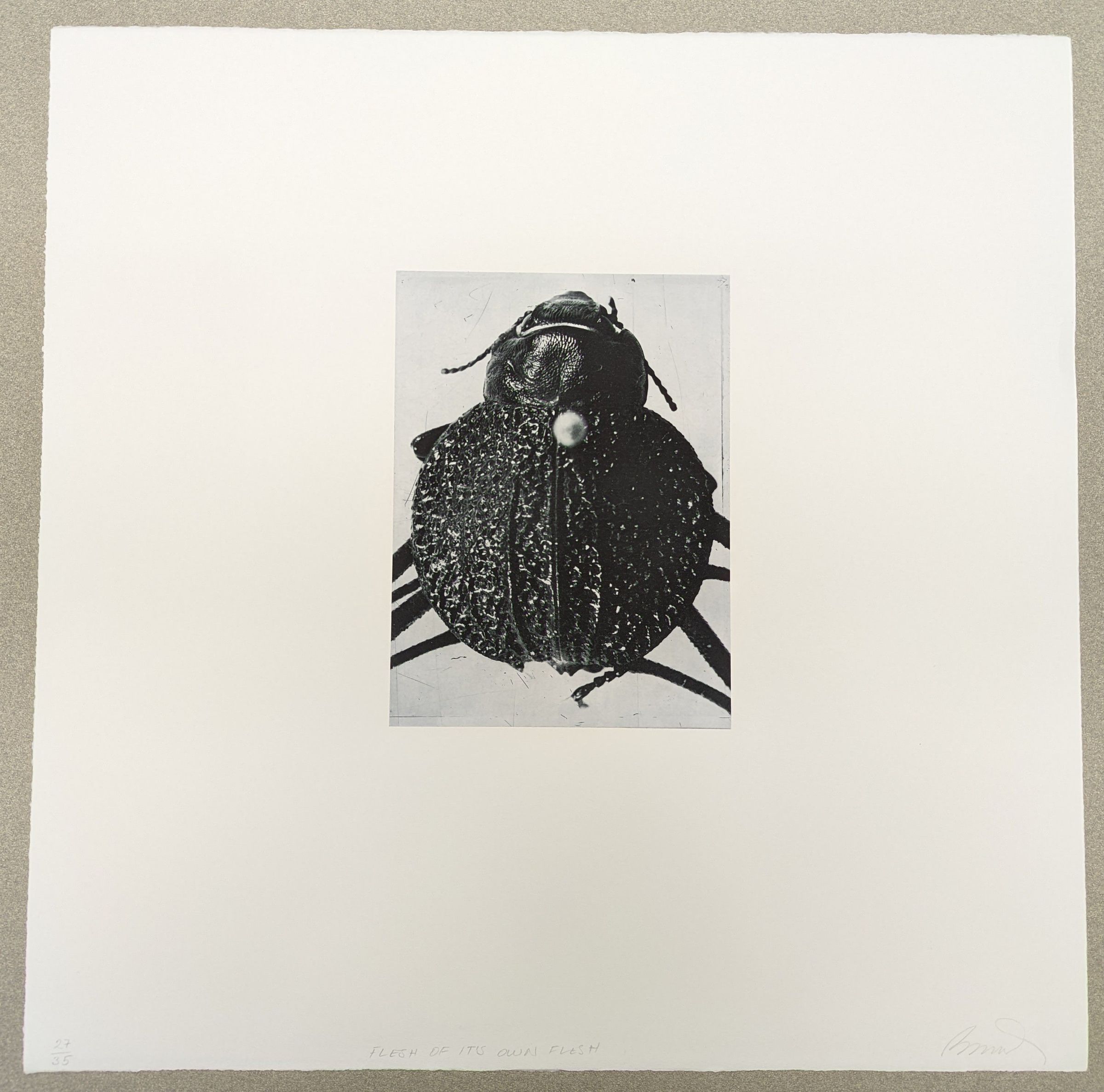 A large print on deckle edged square paper. In the center of the paper is the printed top-down photograph in black and white of a pimelia beetle with its legs splayed out and curled back under themselves and its antennae tilted back. Between its thorax and abdomen is a small pale ball, blurry and out of focus.Context