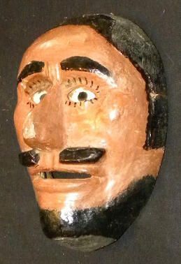 A life-sized oval wood mask depicting a man with a light walnut brown complexion. Black eyebrows are over glass eyes outlined with black eyelashes. A large angular nose is above a black parted mustache and a wide cutout mouth. There is black hair and a black beard. A wire is attached to the back.Context