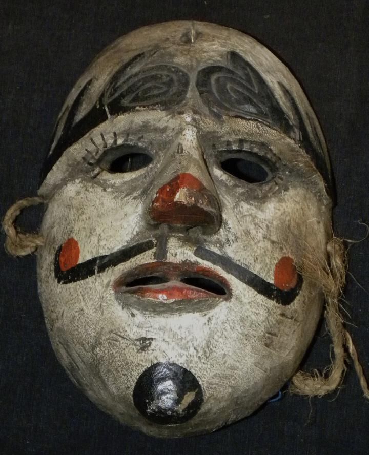 A life-sized round wood mask depicting a male figure with a white face. Two oval cutout eyeholes are under painted black lashes and intricate black eyebrows. A short nose is above a thin parted black mustache that curls around red cheek circles. The red mouth is open and above a large chin with a small goatee. A wire and rope are attached to the back of the mask. Overall signs of scratches, stains, and paint loss.Context