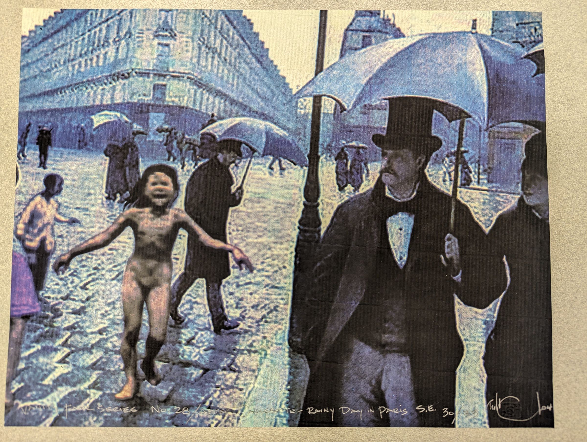 A medium, horizontal print showing a section of Caillebotte's "Paris Street; Rainy Day," over which is superimposed images from Nick Ut's "Napalm Girl" photograph, primarily the image of a girl running naked and screaming on the left.Context