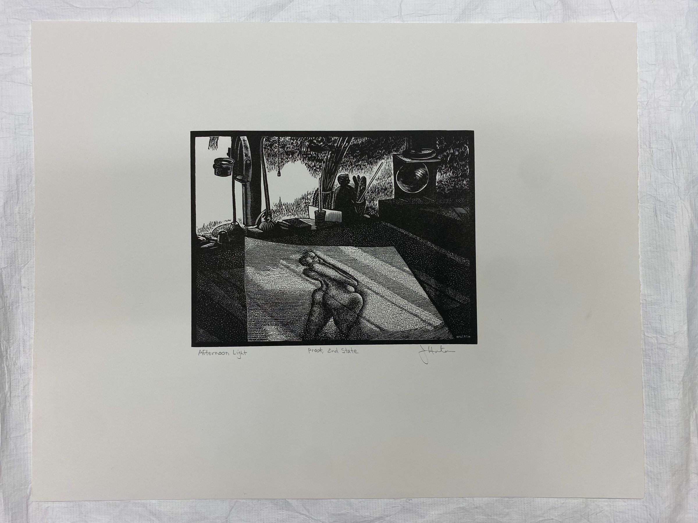A horizontally oriented print of an outdoor scene, composed of black and white marks, appears to be under some sort of shed or awning. The composition of a nude figure image is seen on a large canvas, towards the bottom of the print.Collection