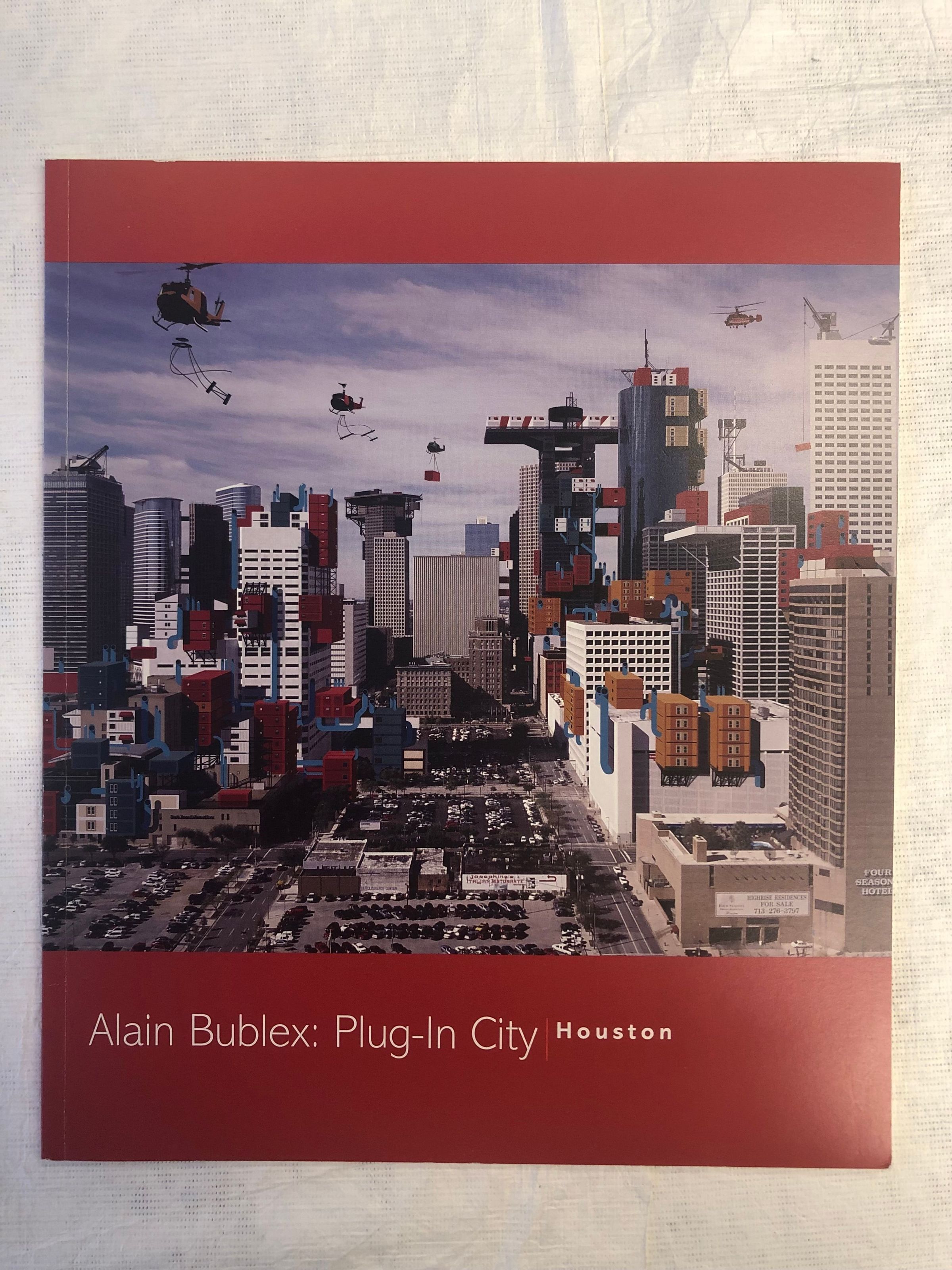 A medium sized, thin red book with a cityscape artwork across the cover, the title in white at the lower left. The interior contains an exhibition catalogue with an interview with the artist in English (black) and French (red), the images in color.Collection