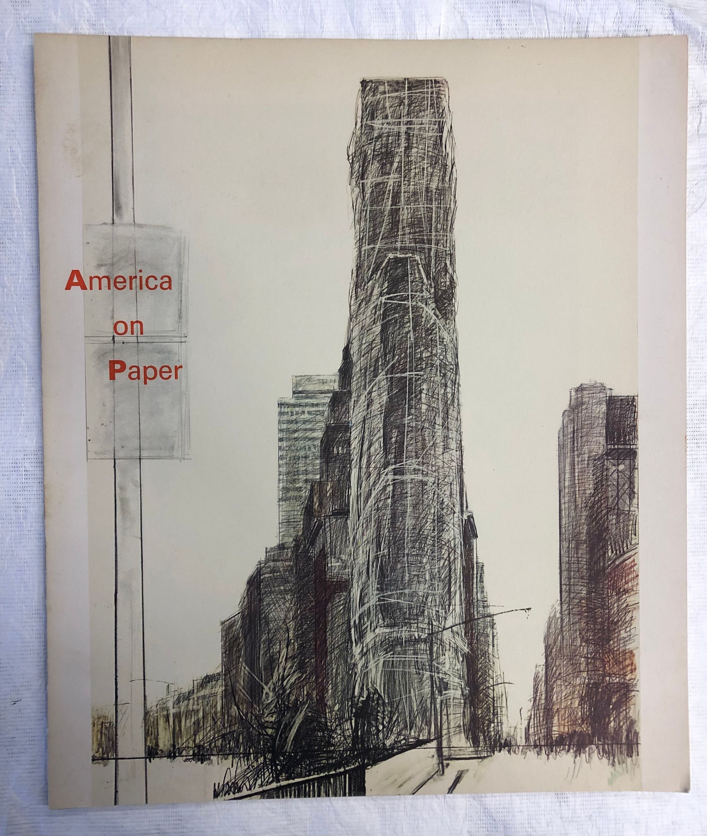 A large, thin, white book with pencil drawings of city scrapers on the front cover with the title in red to the central top left. The interior contains an exhibition catalogue in an accordion format that folds out, with the images in color.Collection