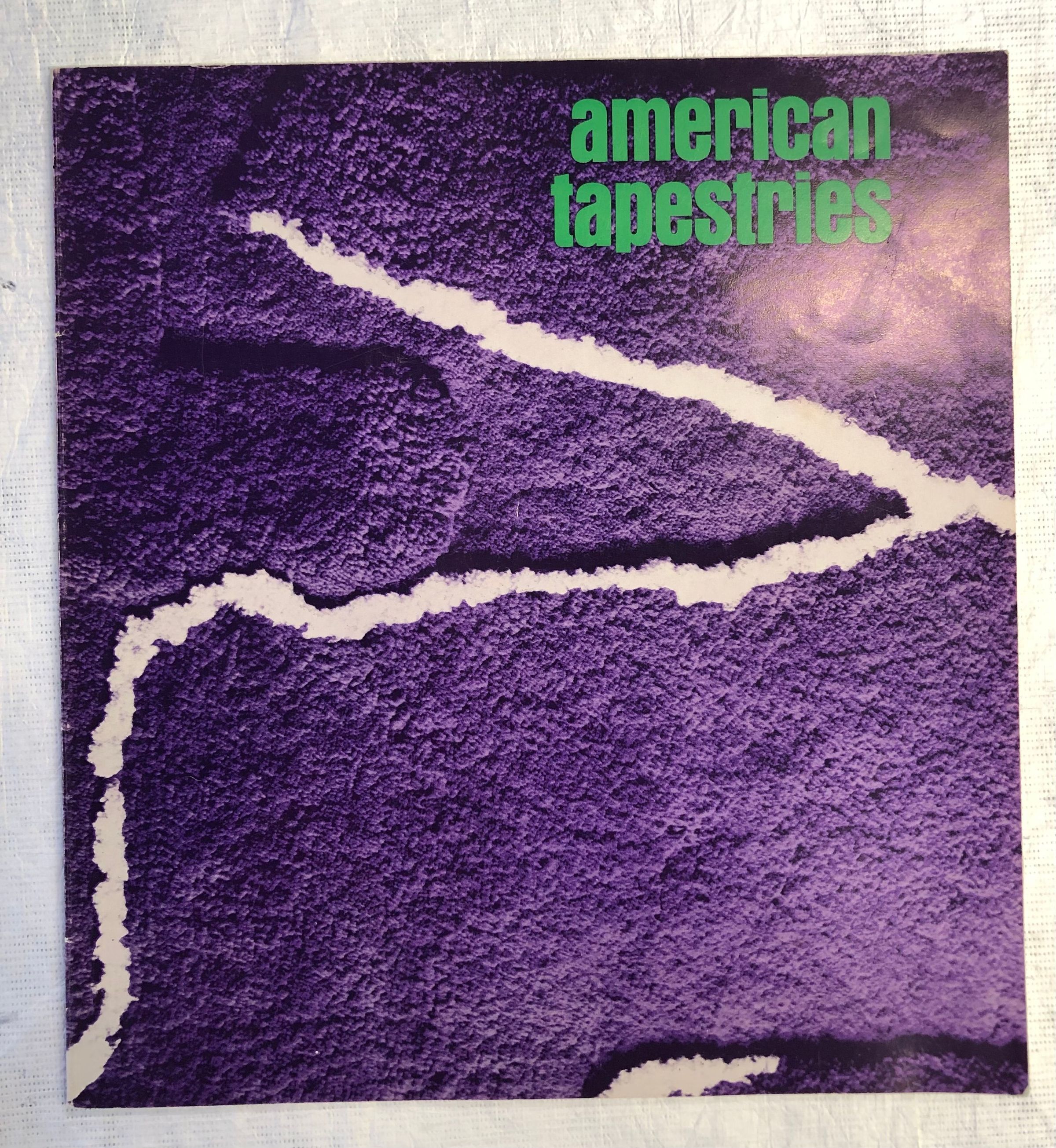 A medium, thin, purple book with fuzzy fabric texture and the title in green at the top right. The interior contains an exhibition catalogue, with the introduction detailing the progress of textile art in America, with the images in color.Collection