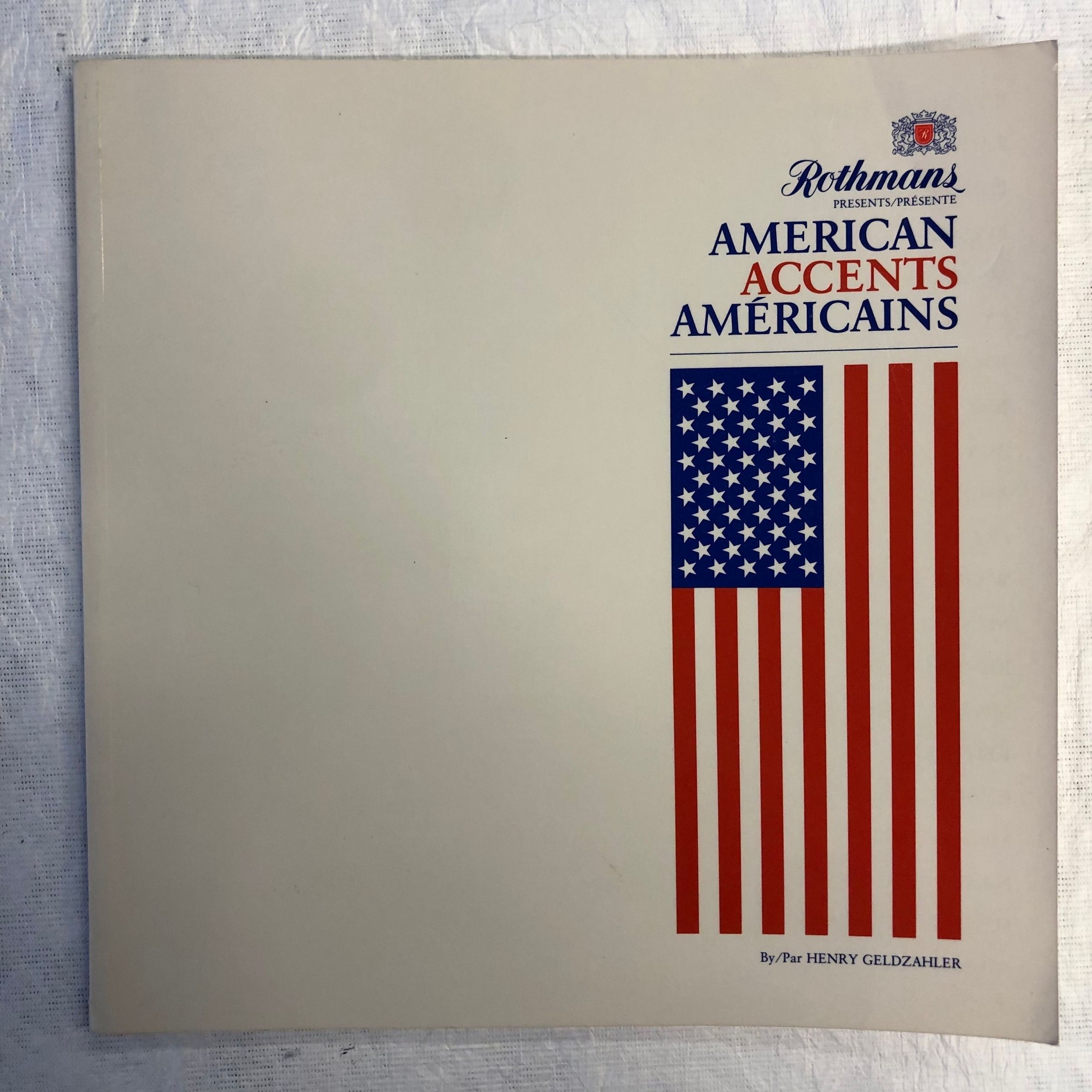 A medium sized, thin, white book with the tile stacked in blue and red text in the top righthand corner, and a vertical American flag below it. The interior contains an exhibition catalogue following the ambassador to Canada's presentation of the works within, also translated in French, with the images in color.Collection