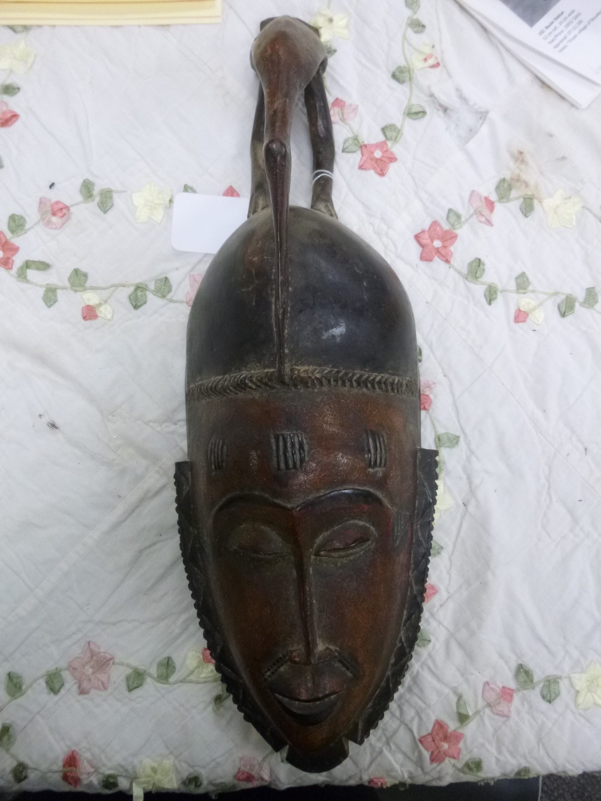 A mask of an elongated human face with scarification on the forehead and a beard along each side of the mask. The top of the mask has a bird-like shape with legs bent and its beak down against the hairline of the mask. The edge of the mask has holes for tying.Collection