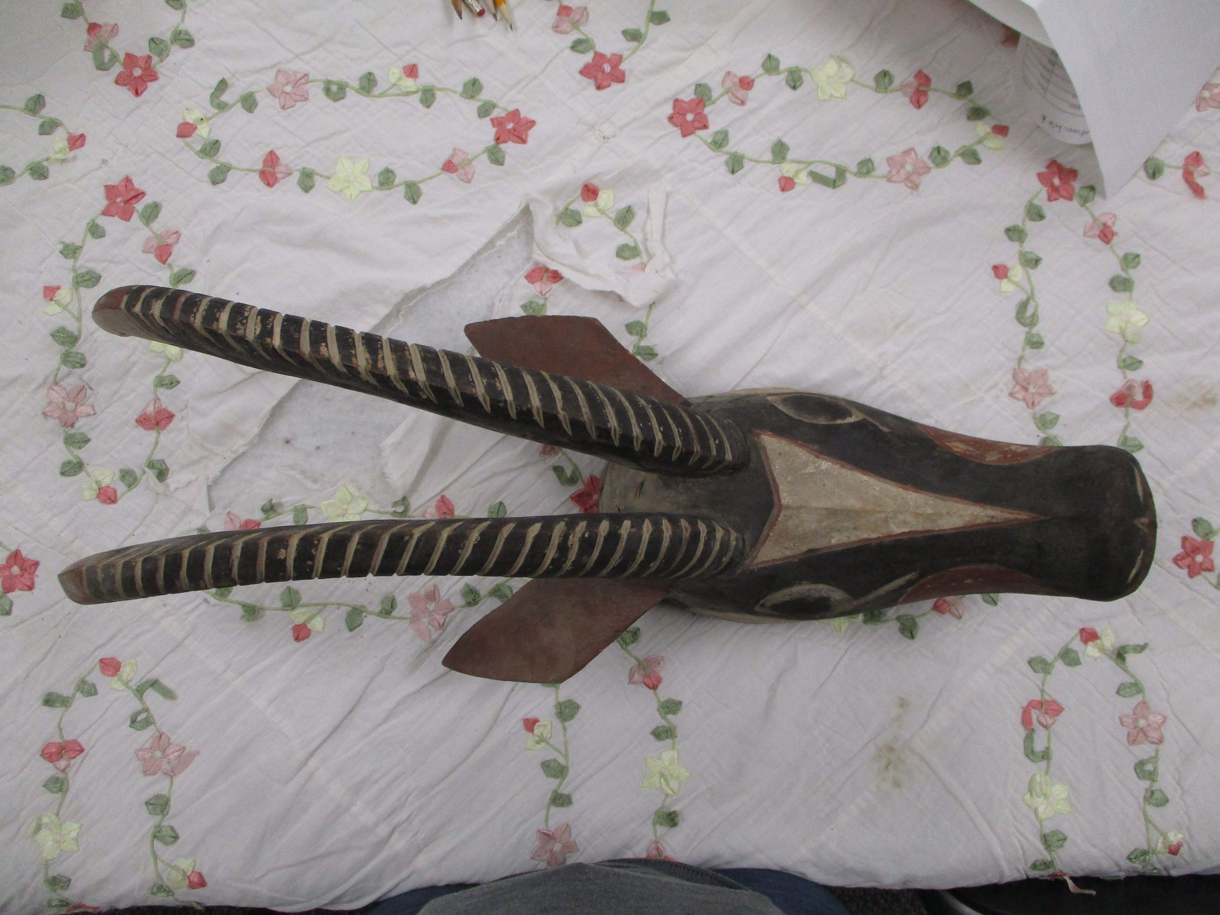 Medium wooden antelope mask painted in black, red, and tan with gesso paint. A wire for hanging is affixed via drilled holes.Collection