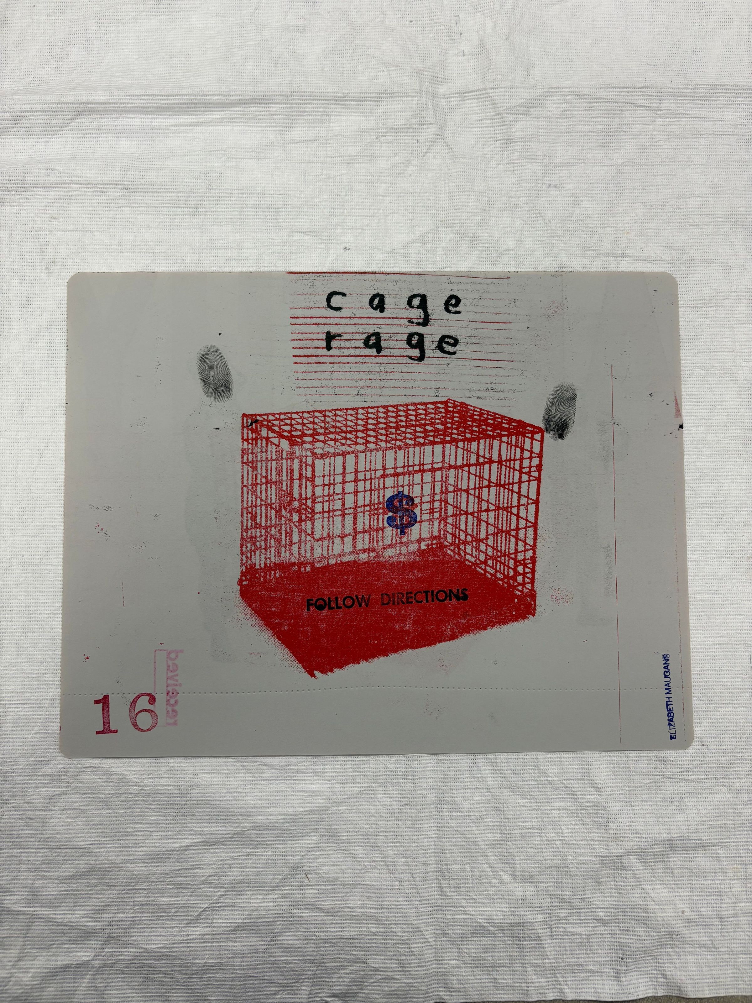 A horizontally oriented, standard letter sized print with a mix of text and imagery. The print has an image of a red cage with text and fingerprints on the front and on the back there is another cage with human figures and text around it.Collection