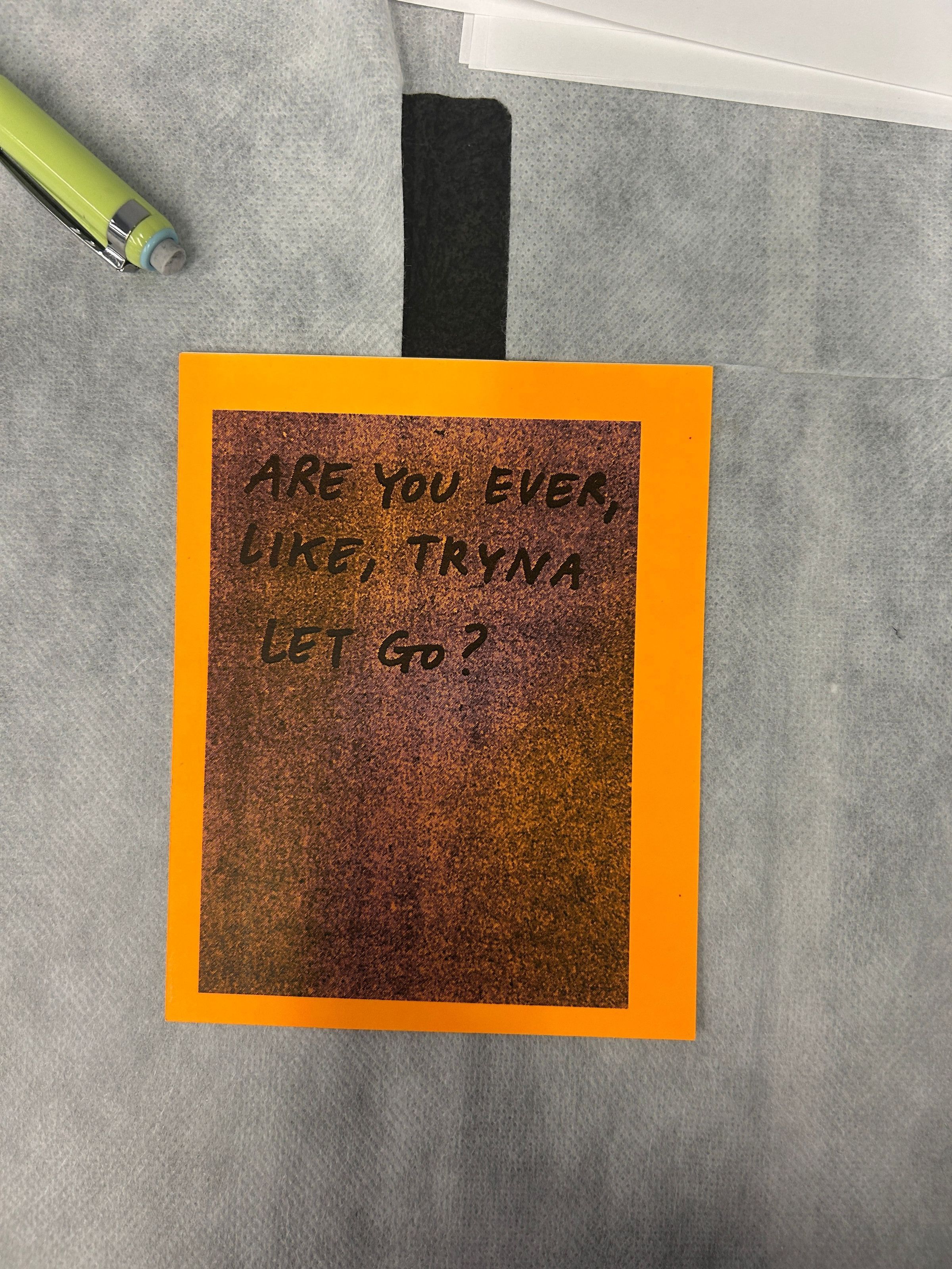 A Balck and orange sticker that reads "Are You Ever, Like, Tryna Let go"Collection