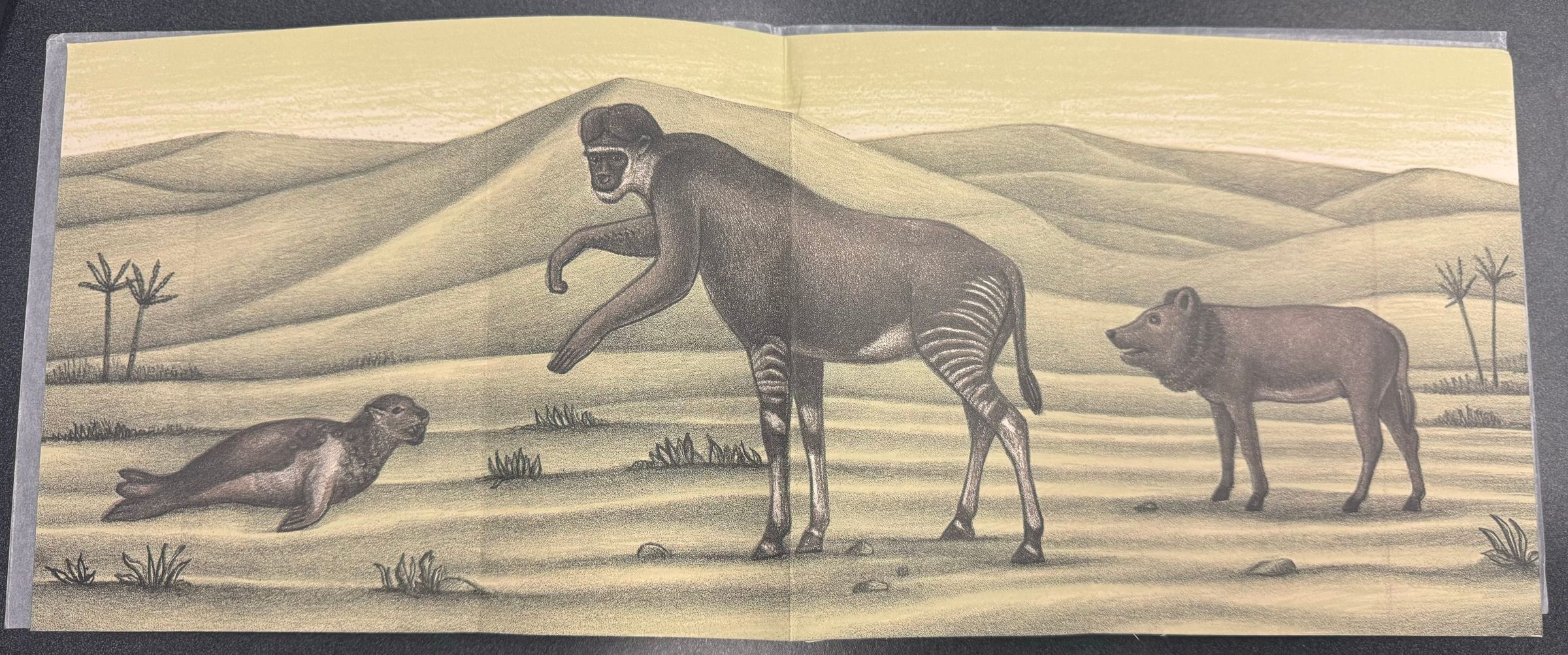 A long horizontal print made of two attached pieces of paper that folds in half and has a piece that pops out. Includes images of animals and trees on a yellow and green background. The text is likely digital screen print while the image is a lithograph.Context
