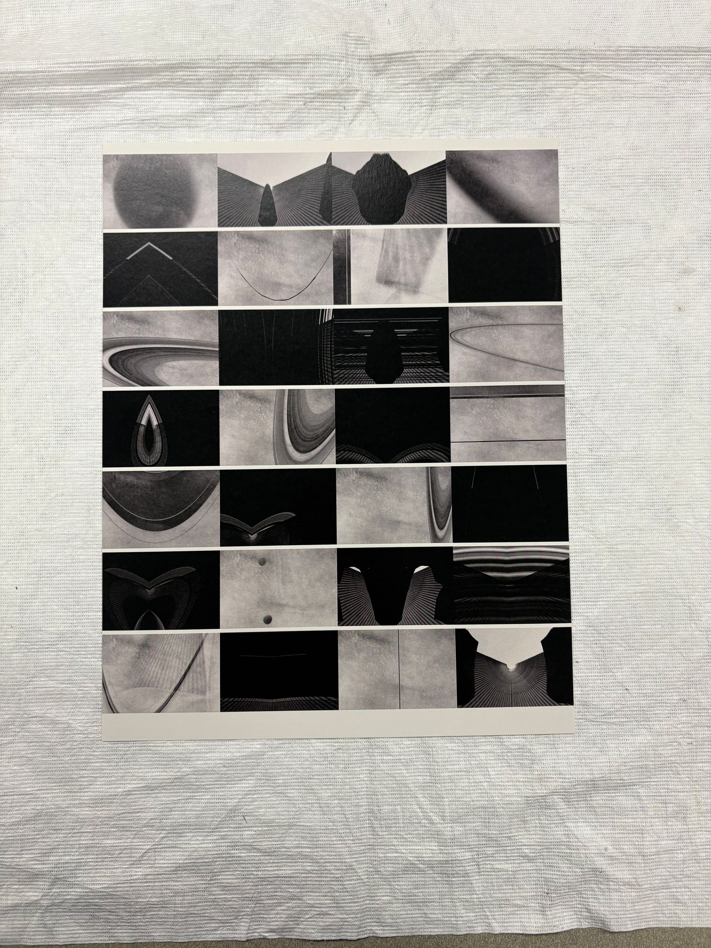 A vertically oriented, standard letter sized print that consist of black and white images. The print has 28 different frames that are organized like photographs with curving and organic lines and forms.Collection
