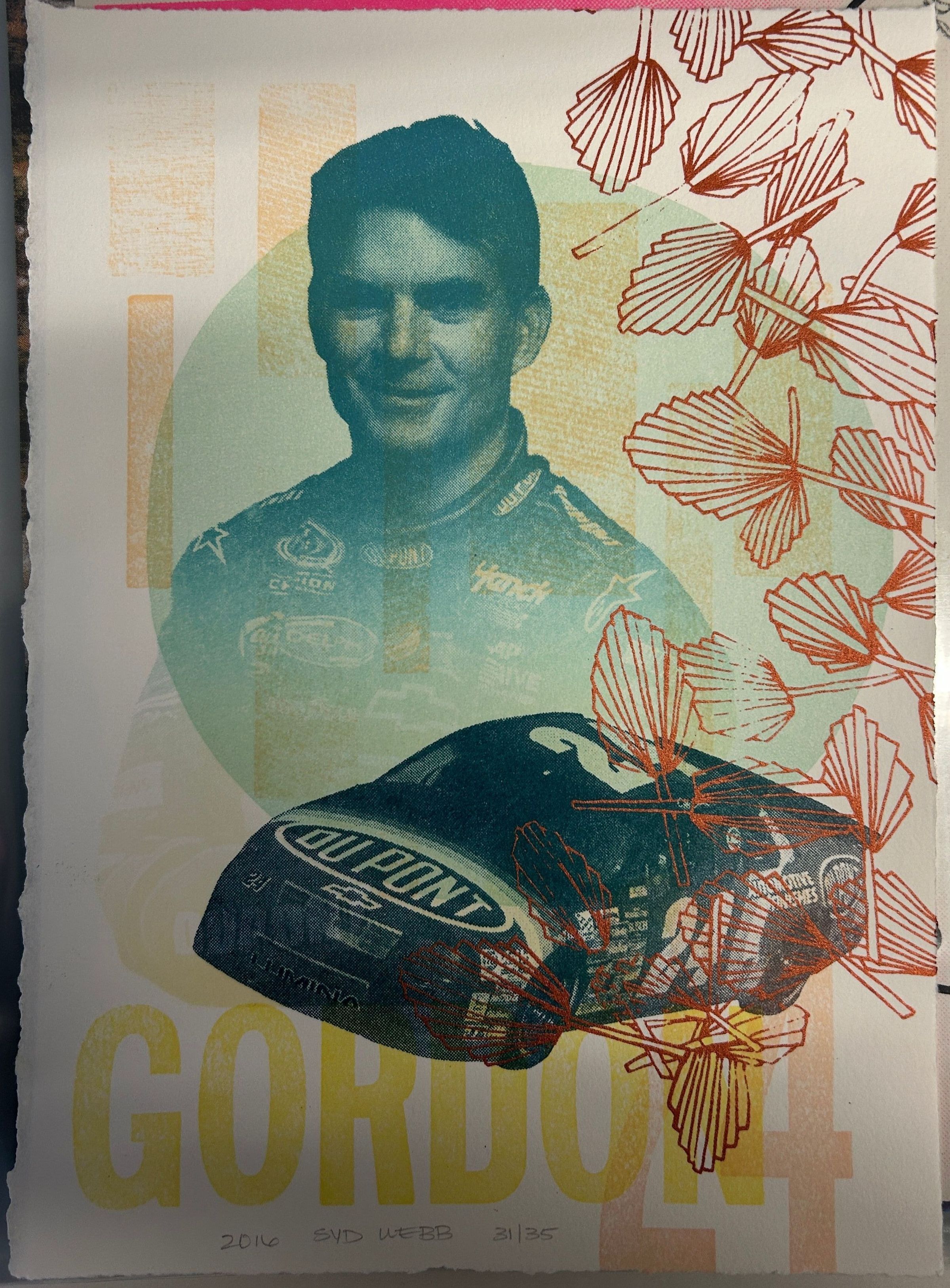 A small and colorful print of a racecar driver surrounded by circular, rectangular, and leaf forms.Collection