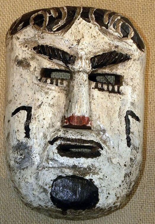 A long rectangular wood mask depicting a male figure with a white face and short black hair with incised curls. Rectangular cutout eyeholes with painted black eyelashes under furrowed black eyebrows. A long, flat nose has red paint on the tip. There are black lines on the cheeks, a thin black mustache, and a closed black mouth. A large black circle on the chin mimics a goatee. A wire is attached to the back of the mask. Overall signs of paint loss.Context