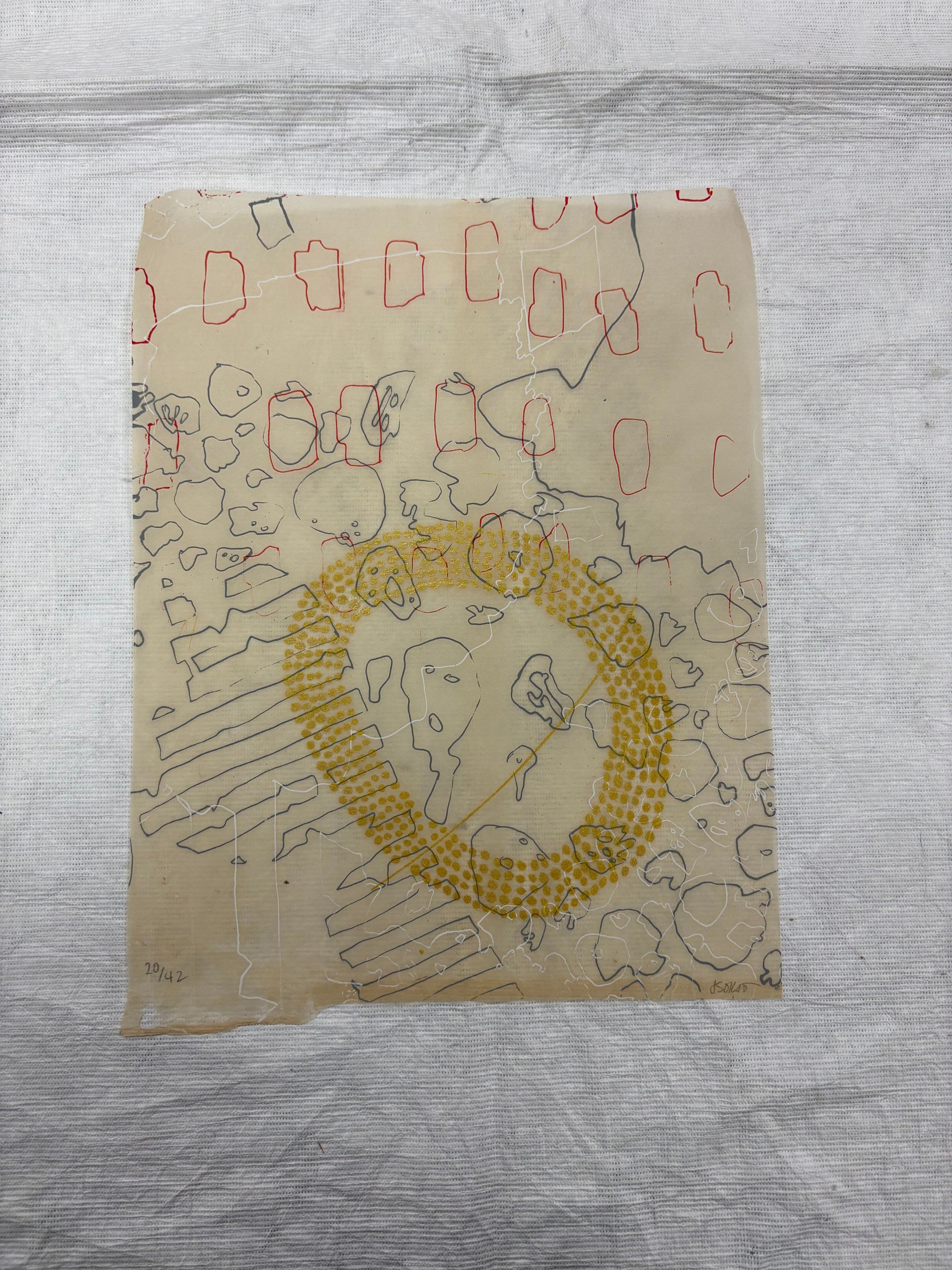 A vertically oriented print on thin and translucent Japanese tissue paper. The print has various shapes overlapped with one another and the pigment has bleed through to the back of the page.Collection