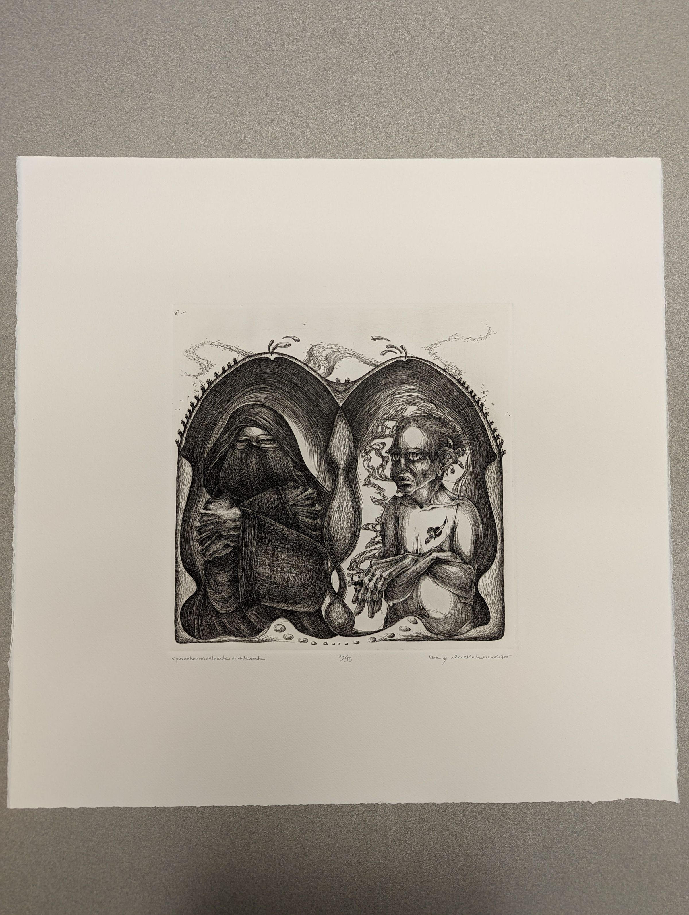 A large black and white intaglio print on deckle edged paper. Inside the impression of the central plate is a pair of women's portraits: the one on the left is shrouded in a burka, with her arms crossed and hands clutching her shoulders; the one on the right is wearing only a bra and has a tattoo of a knife through a heart on the left side of her chest. She otherwise has short hair, many piercings, vertical stripes going across her eyes, and is smoking a cigarette she holds in her left hand, with her arms crossed. Both women are stylized with large heads and features and very large, bony hands. They are encompassed in a pair of stylized arches/alcoves.Context