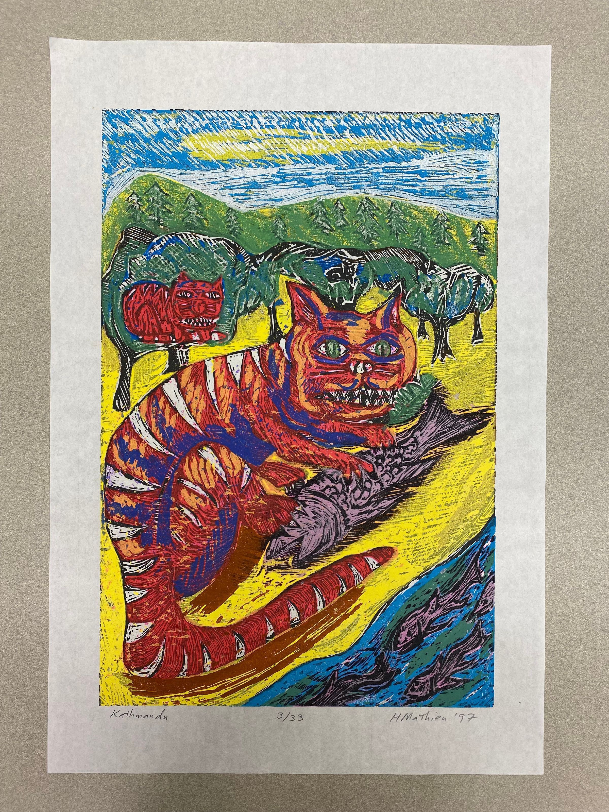 A large horizontally oriented print depicting a large red and orange cat in the center of the composition who is handling a purple fish. On the bottom right corner of the image, a river is depicted in front of the large cat, suggesting they had just caught it. Behind the cat displays a landscape with trees and another red cat resting within a tree creating the illusion of spatial depth.Collection
