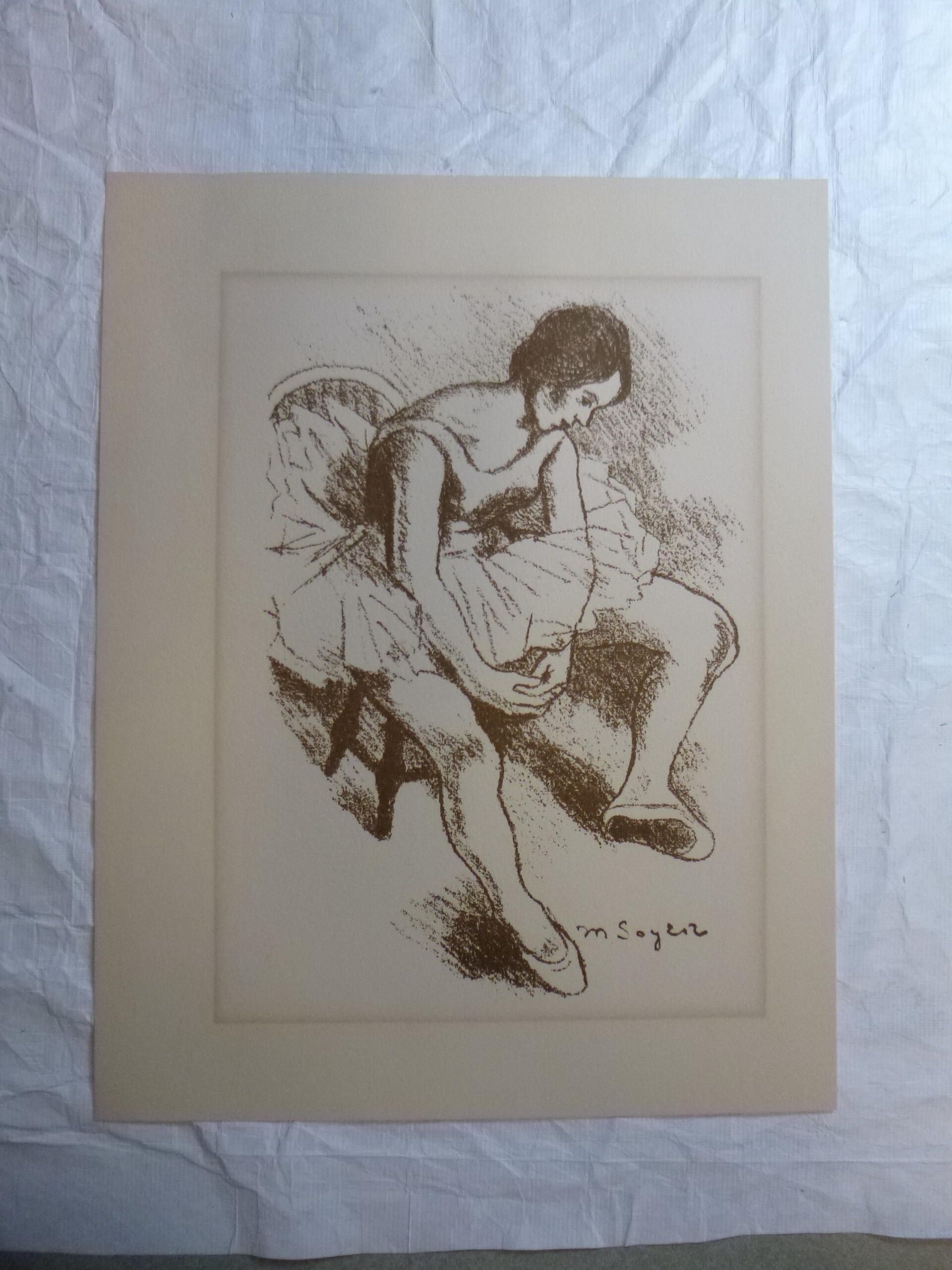 Small, vertically-oriented print of a ballerina seated on a stool with her hands interlocked, performing warm-up stretches.Collection