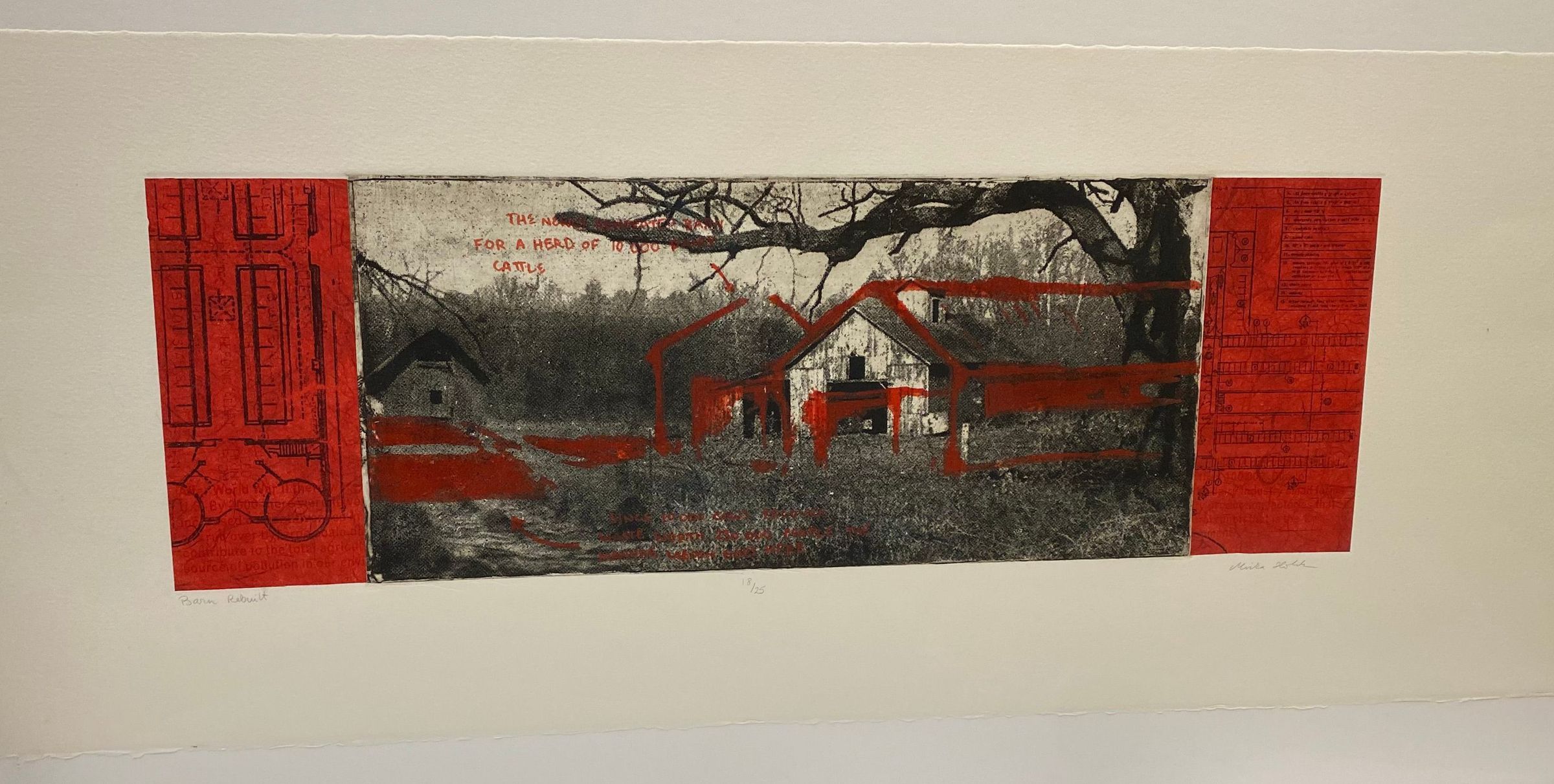 Large horizontally oriented relief print utilizing a three-plate process on cotton rag paper. The central image is of a black-and-white set of barn structures in nature with a red overlay of pigment and printed text. Flanked on either side of the barn imagery are prints of building schematics in black pigment with red background.Collection