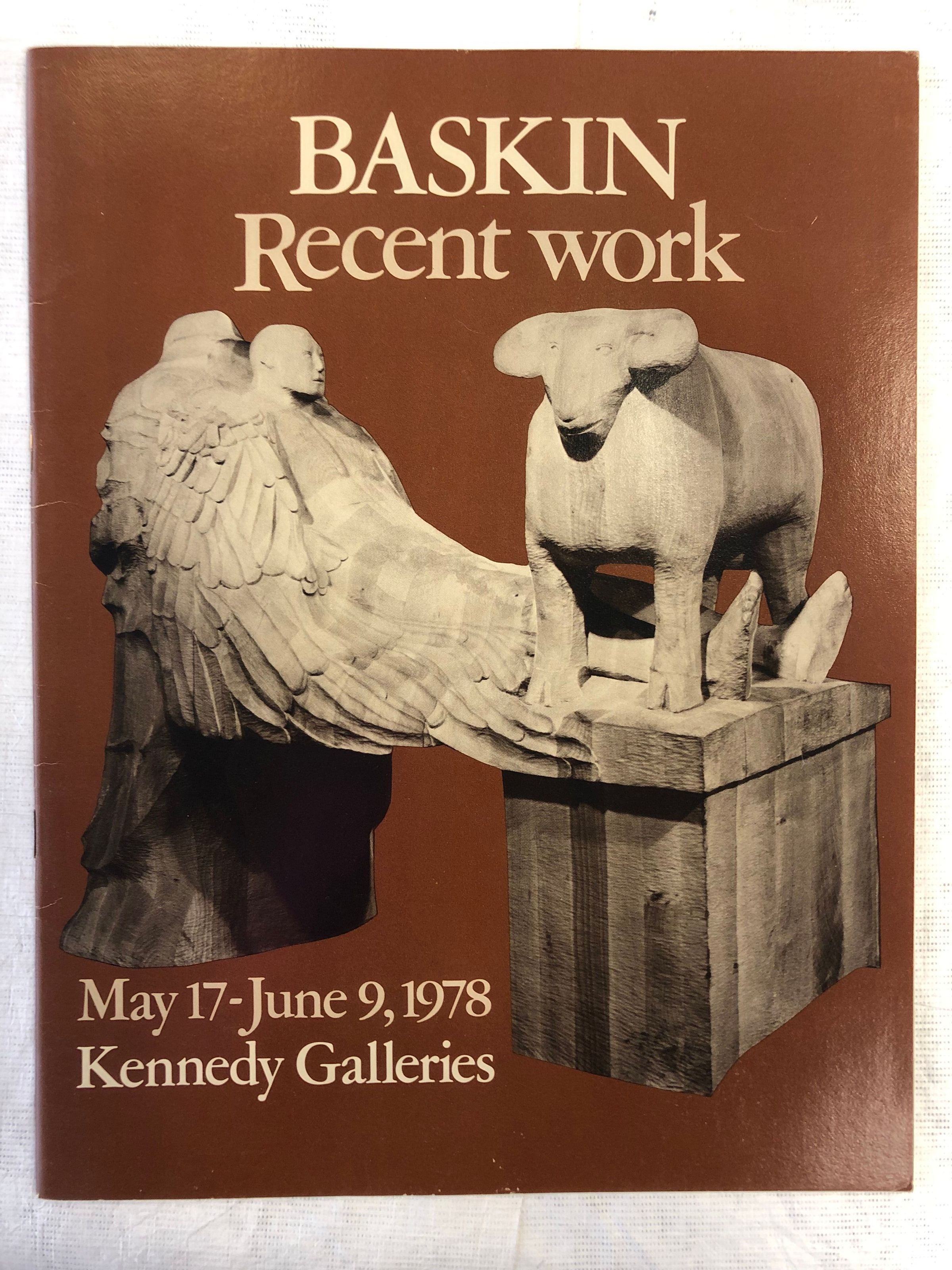 A large, thin brown book with the title at the central top in white, an image of a seated sculpture of an angelic figure with a ram sculpture. The interior contains an exhibition catalogue, the images in black and white.Collection
