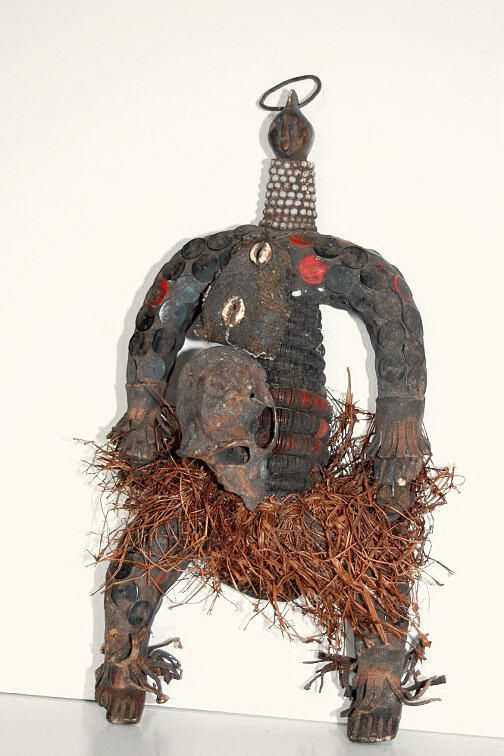 Small wood figure with arms and legs open, with an encrusted torso of beads, shells, rope, tacks, and with animal skull attached.Collection