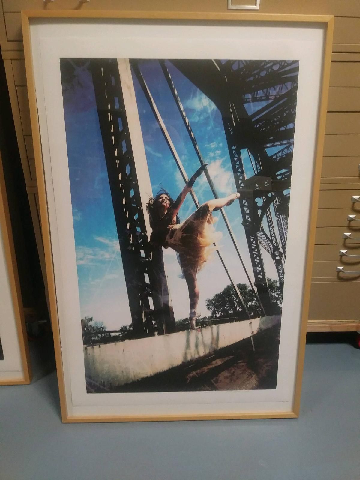 Large vertical digital photograph of a ballerina dancing on a steel bridge with elements of digital manipulation.Collection