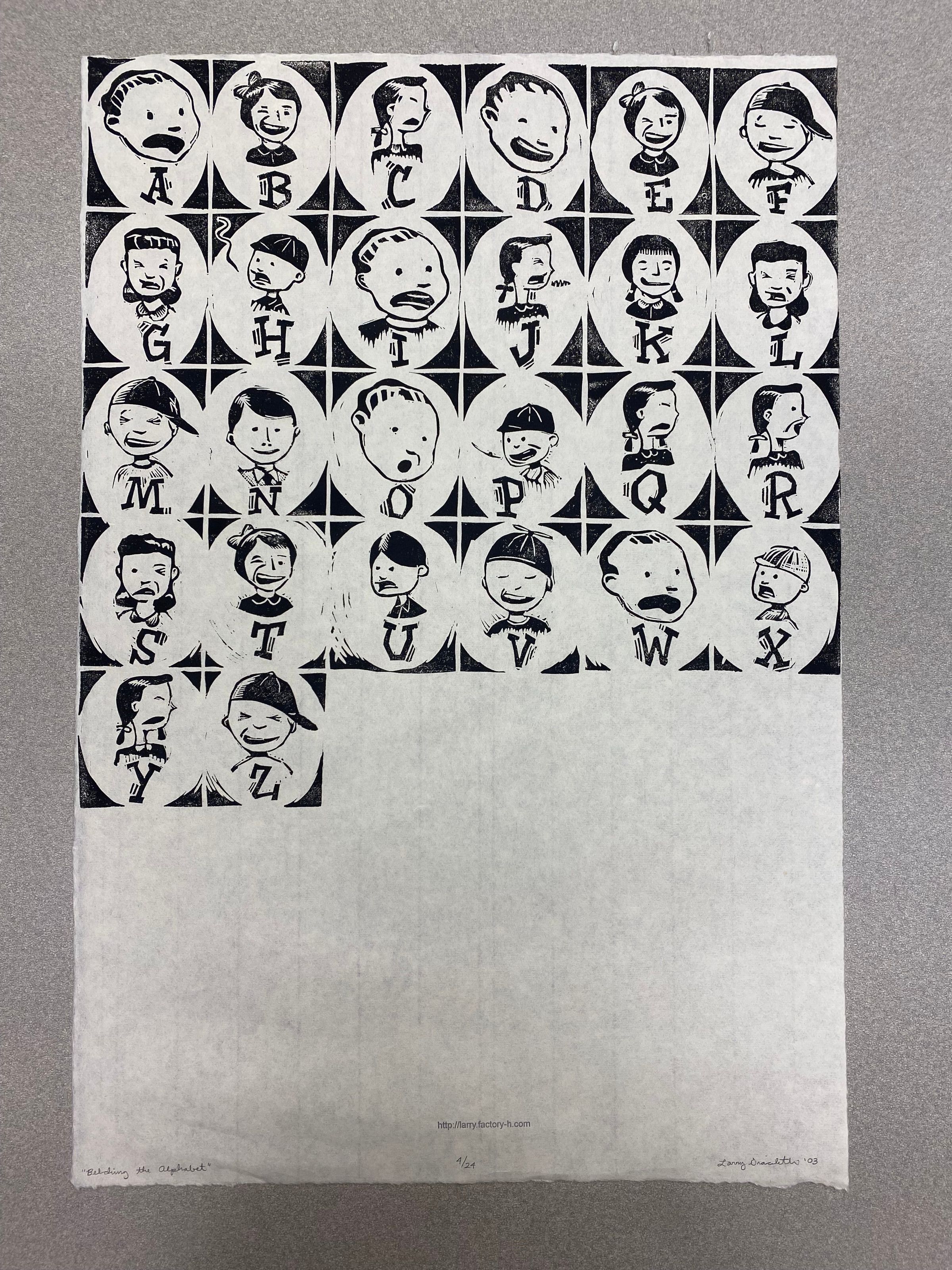 A large vertically oriented print containing a grid layout (occupying three-quarter's of the image) of adolescent figures belching the alphabet in a black and white comic-like style. Each child have different expression to correspond with the sound of each letter. Lines work is use to accent the alphabetical characters to suggest vibration.