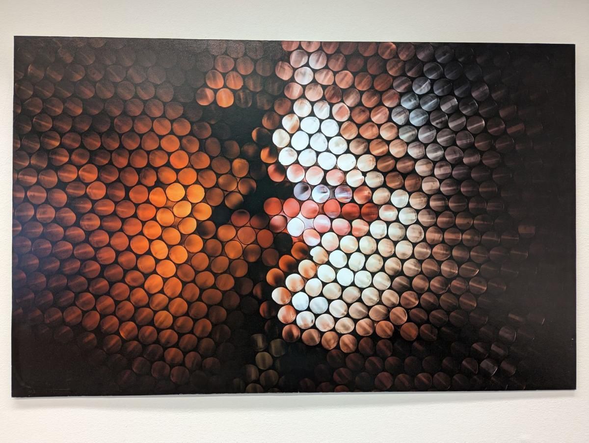 Large horizontally oriented landscape print with circles colored in natural tones.Context