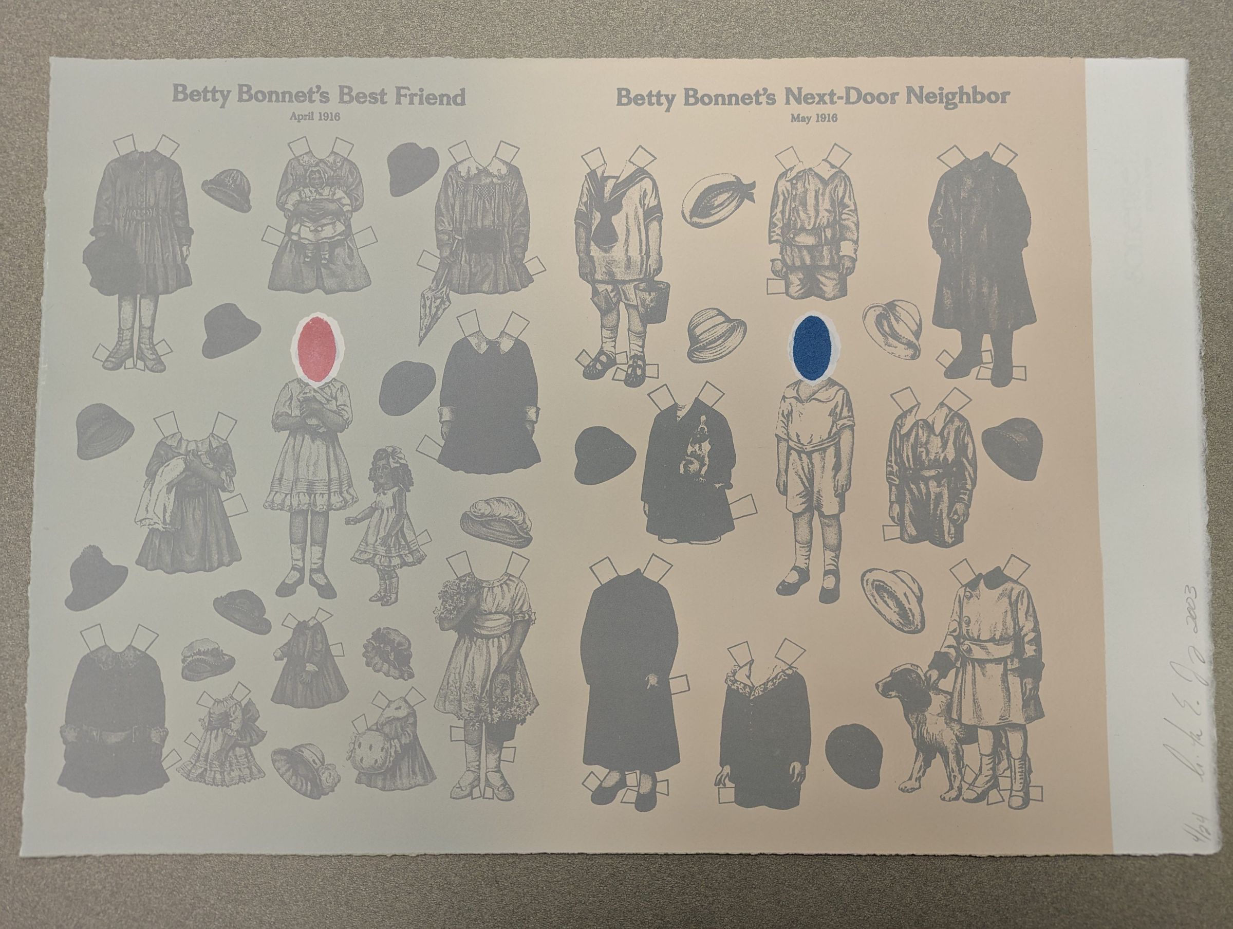 A horizontal print showing rows of children's garments, labeled "Betty Bonnet's Best Friend, April 1916" on the left and "Betty Bonnet's Next-Door Neighbor, May 1916" on the right. A girl on the left has her head blocked out by a pink dot and a boy on the right has his head blocked by a blue dot.Context