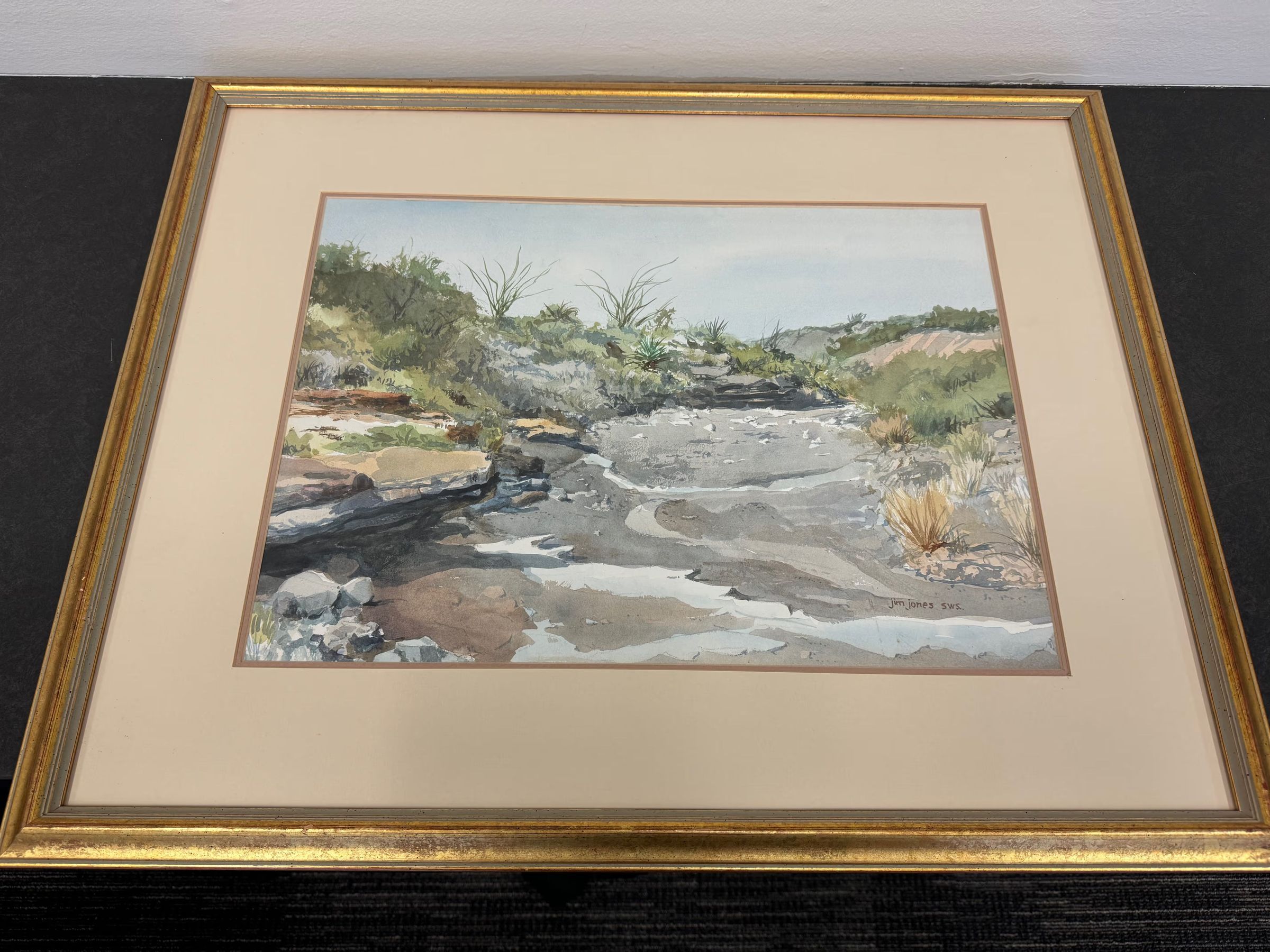 Large painting of Texas or New Mexico landscape. It is made of water color applied on canvas. There is a dried creek or river surrounded by shrubs and flora. The signature of the artist "Jim Jones sws," is on the bottom left.Collection