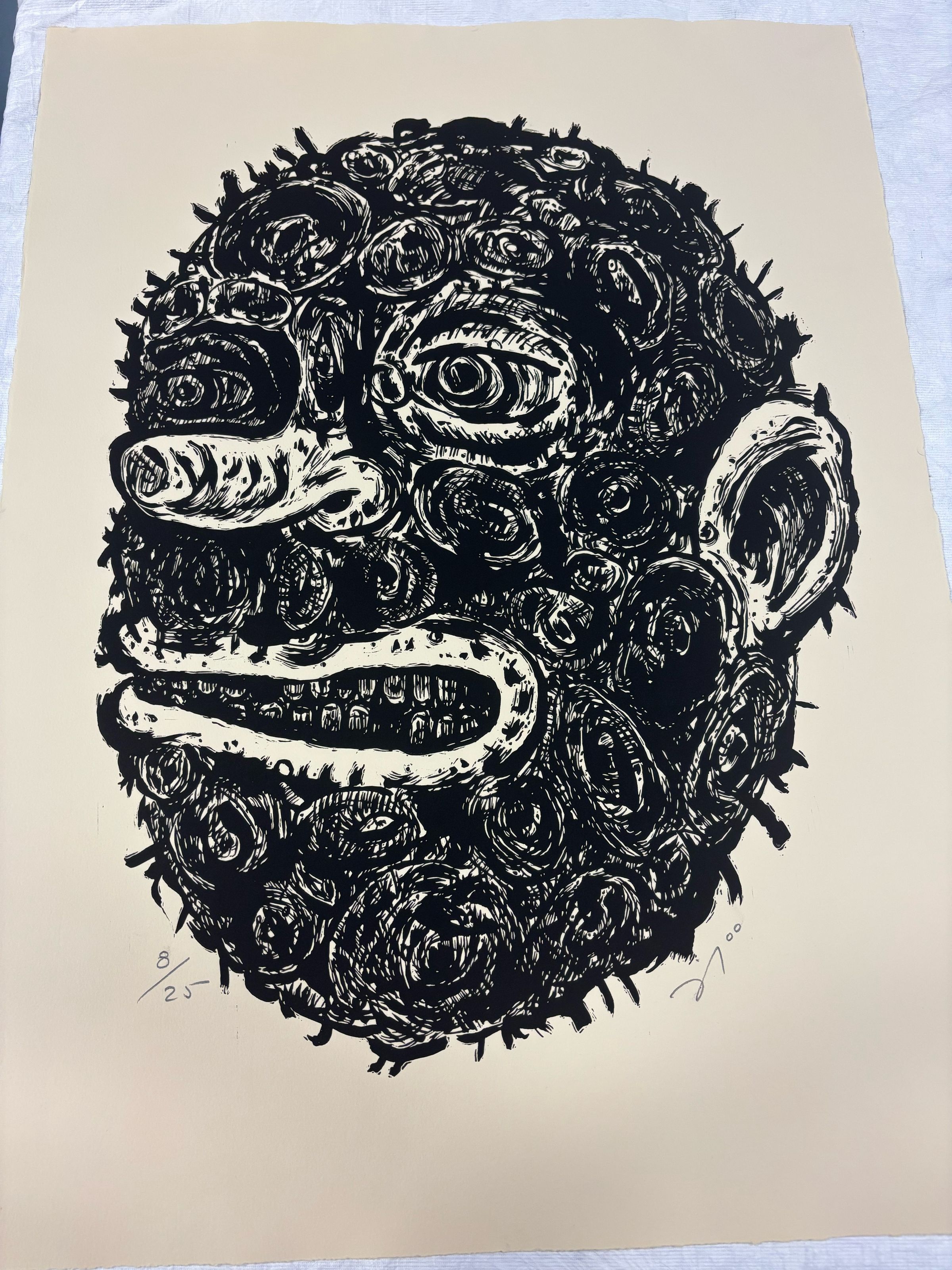 Large, rectangular, vertically oriented print depicting face with a nervous, anxious expression. The face is covered with circular spots.Collection