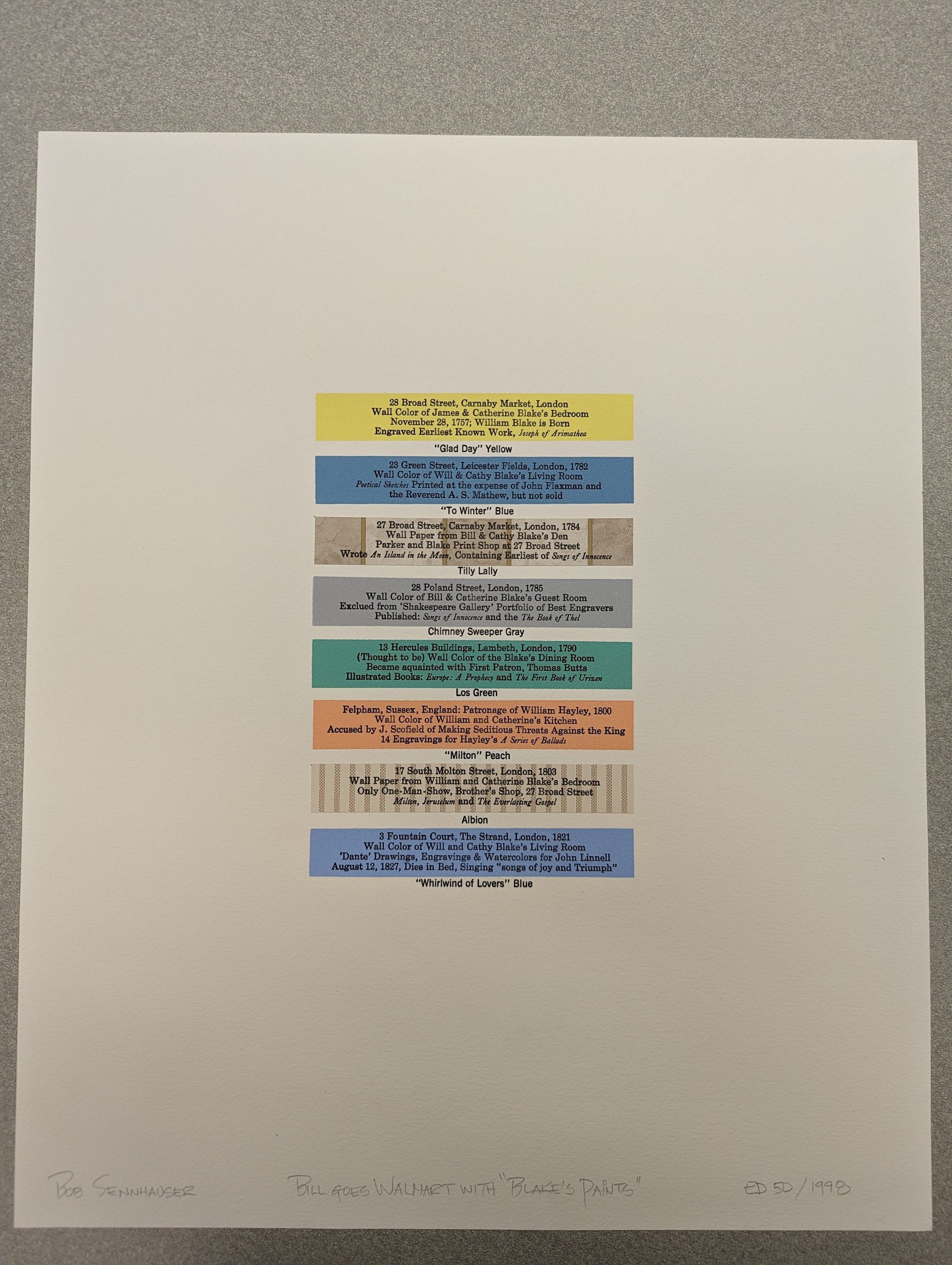 A large vertically-oriented print of a centered stack of eight bands with various labeled colors. The third and seventh ones down are actually separate pieces of patterned paper, affixed to the print. Within each band is four lines of text, including an address, the wall color of a room occupied by the family of William Blake, followed by one or two notable events in William Blake's biography.Context
