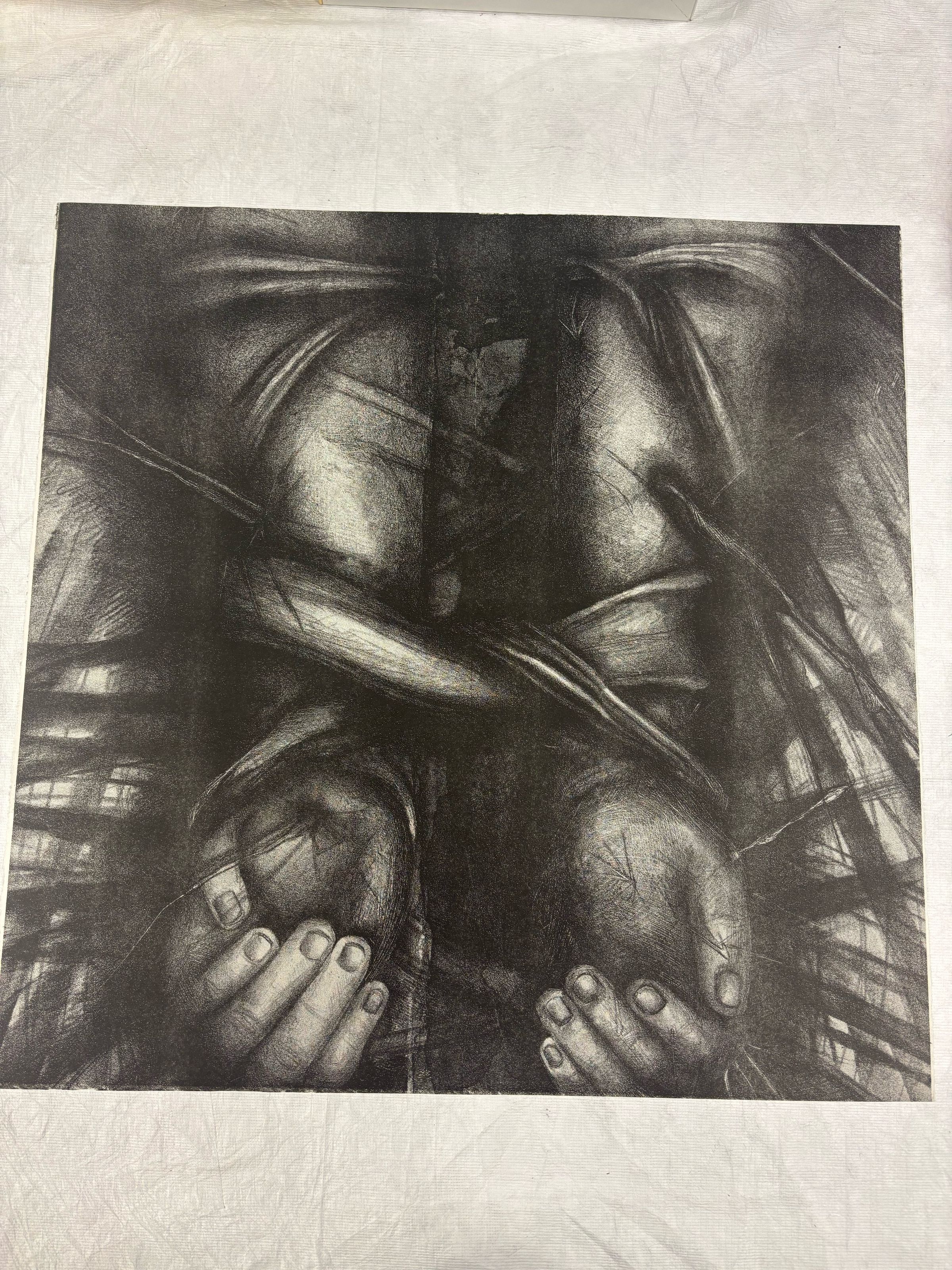 Large, square print depicting a close up of arms with folded hands held together in a bind by ropes in the style of a charcoal drawing. Various lines radiate out from the arms and dark center.Collection
