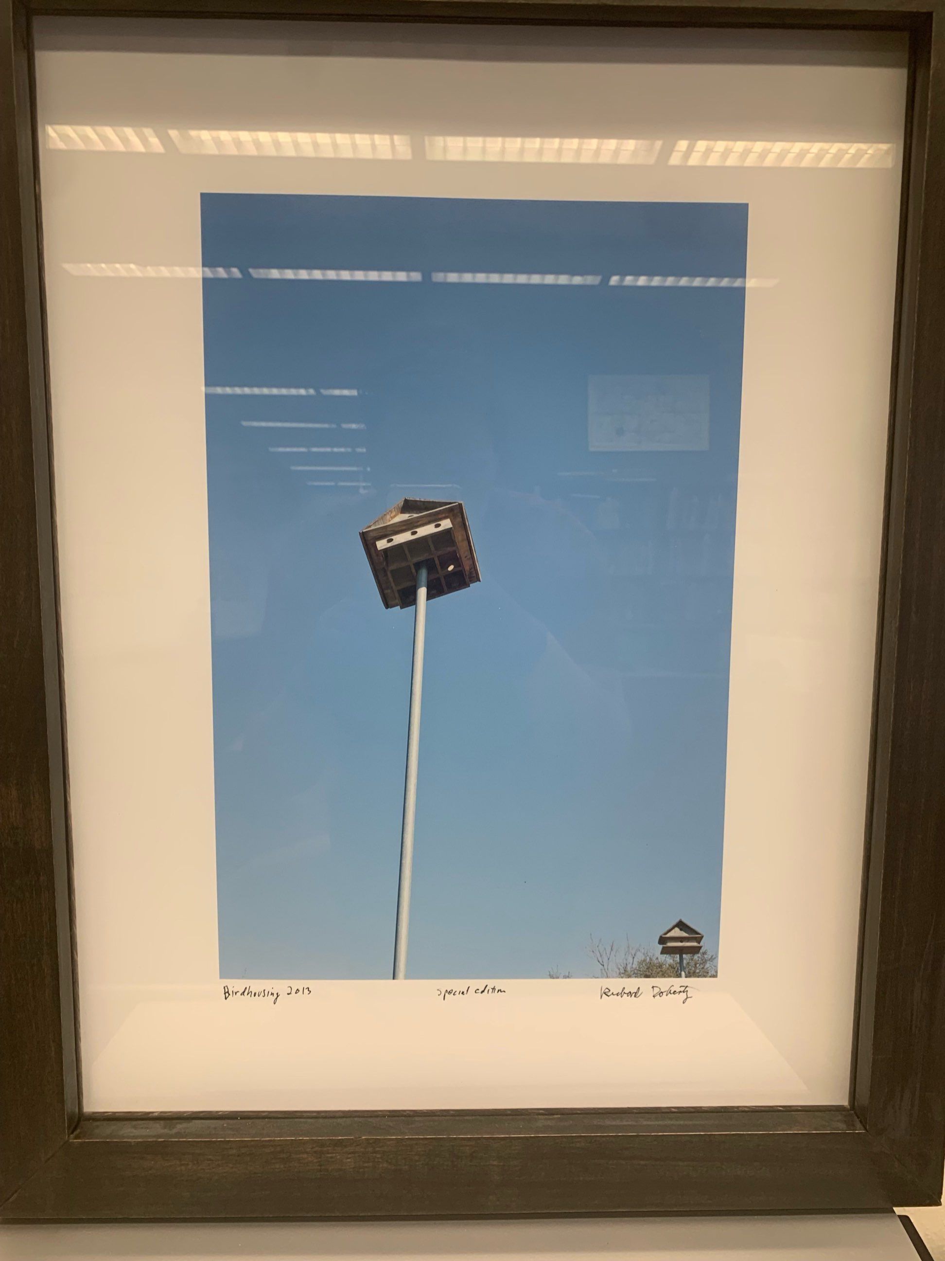 Medium-sized vertically oriented colored photograph of a small birdhouse on a long pole with the blue sky as the background and another birdhouse seen in the bottom right corner.Collection