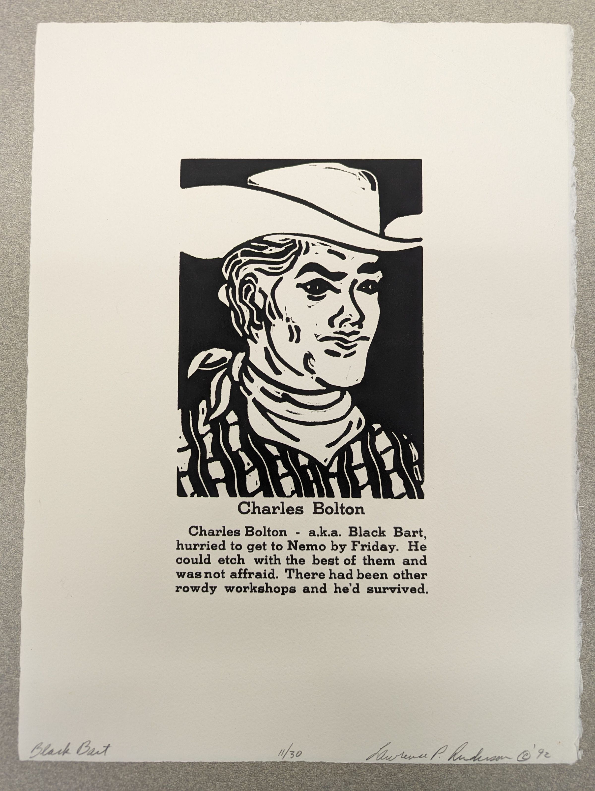 A vertical print showing a portraitin relief of a man wearing a cowboy hat, bandana, and striped shirt, labeled 'Charles Bolton.' The text beneath it reads "Charles Bolton - a.k.a. Black Bart, hurried to get to Nemo by Friday. He could etch with the best of them and was not affraid. There had been other rowdy workshops and he'd survived."Context