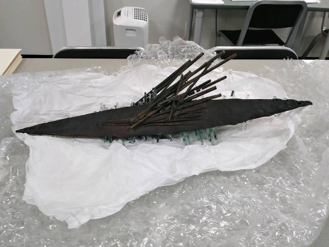 Geometric bronze and glass sculpture in the form of a small boat. Angular shards of glass protrude from the bottom, while thin sticks of bronze come outwards from the top.Collection