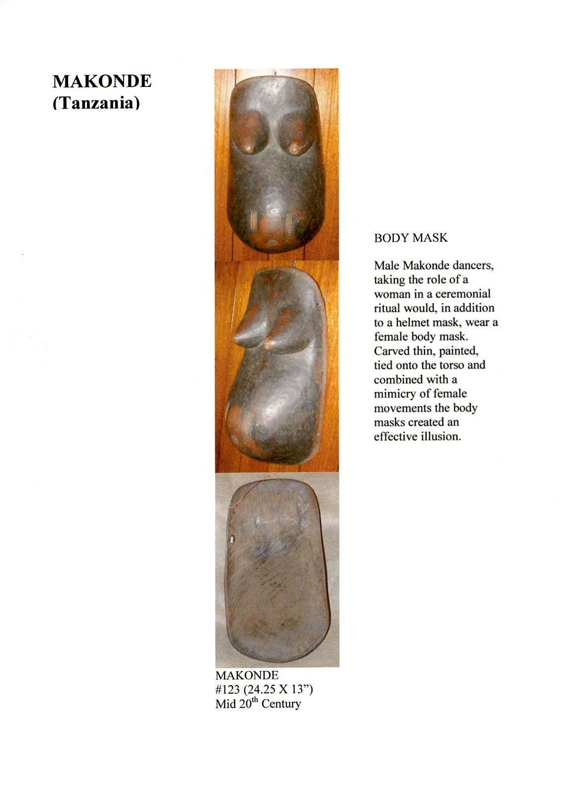 Male Makonde dancers taking the role of a woman in a ceremonial ritual would wear a female body mask, in addition to helmet mask.Collection