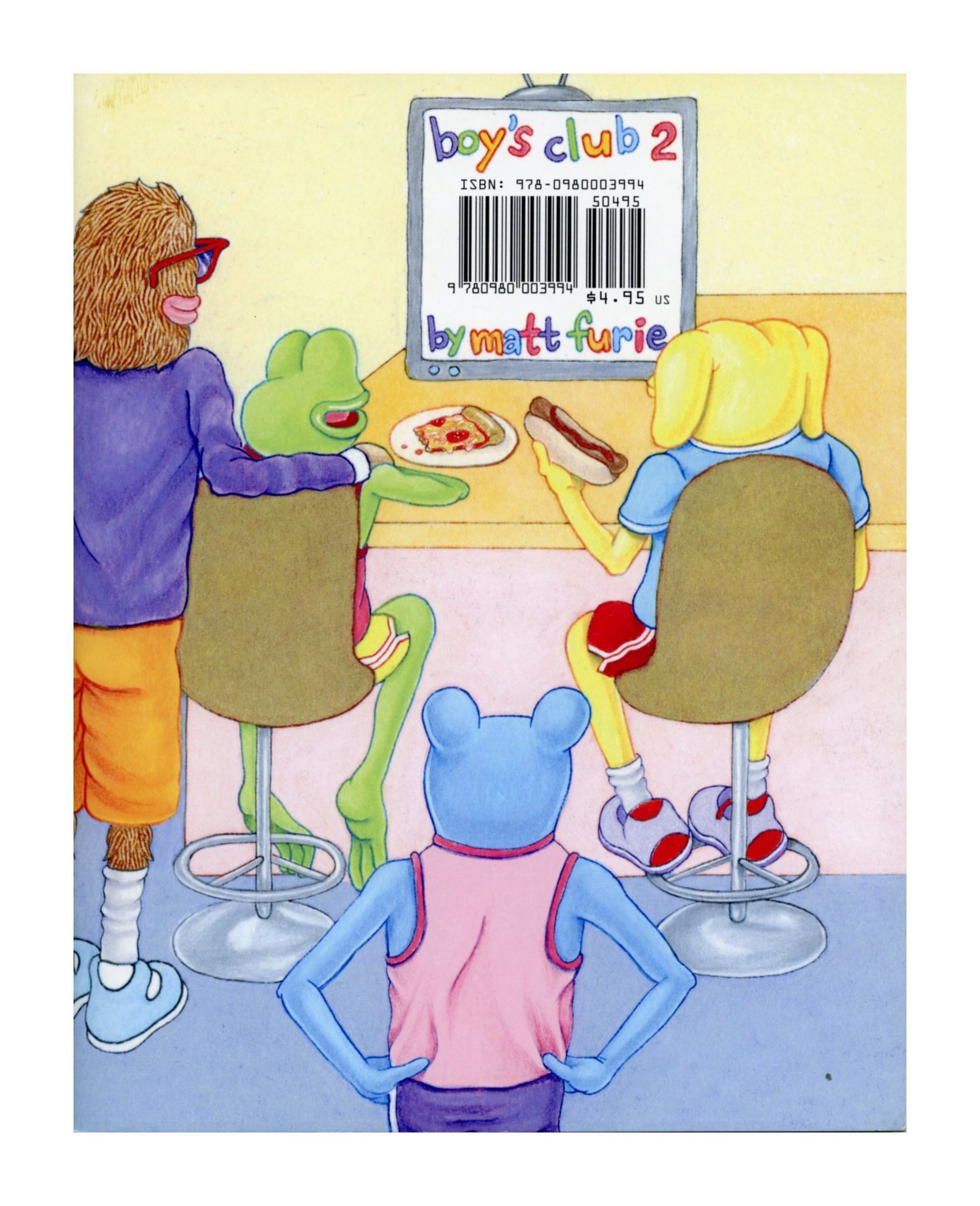 Colorful paper booklet featuring four cartoonish characters in sports wear gathered around a television showing the title in colorful lowercase lettering , followed by an ISBN number and barcode, then the by-line. The characters gather around an island bar, enjoying a pizza and hot dog.Collection