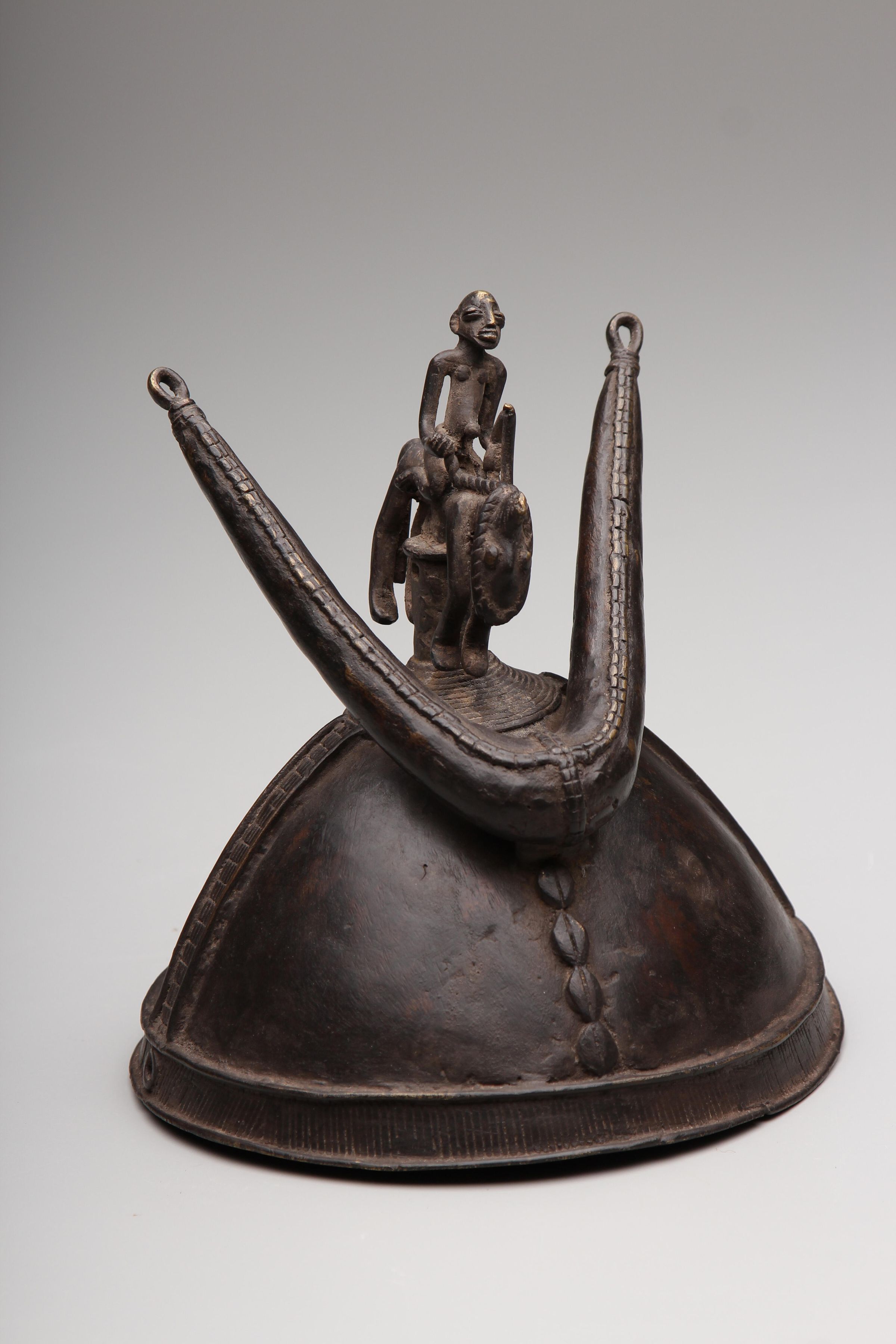 Bronze bowl-shaped helmet with a horse and rider on top behind a V-shaped crestCollection