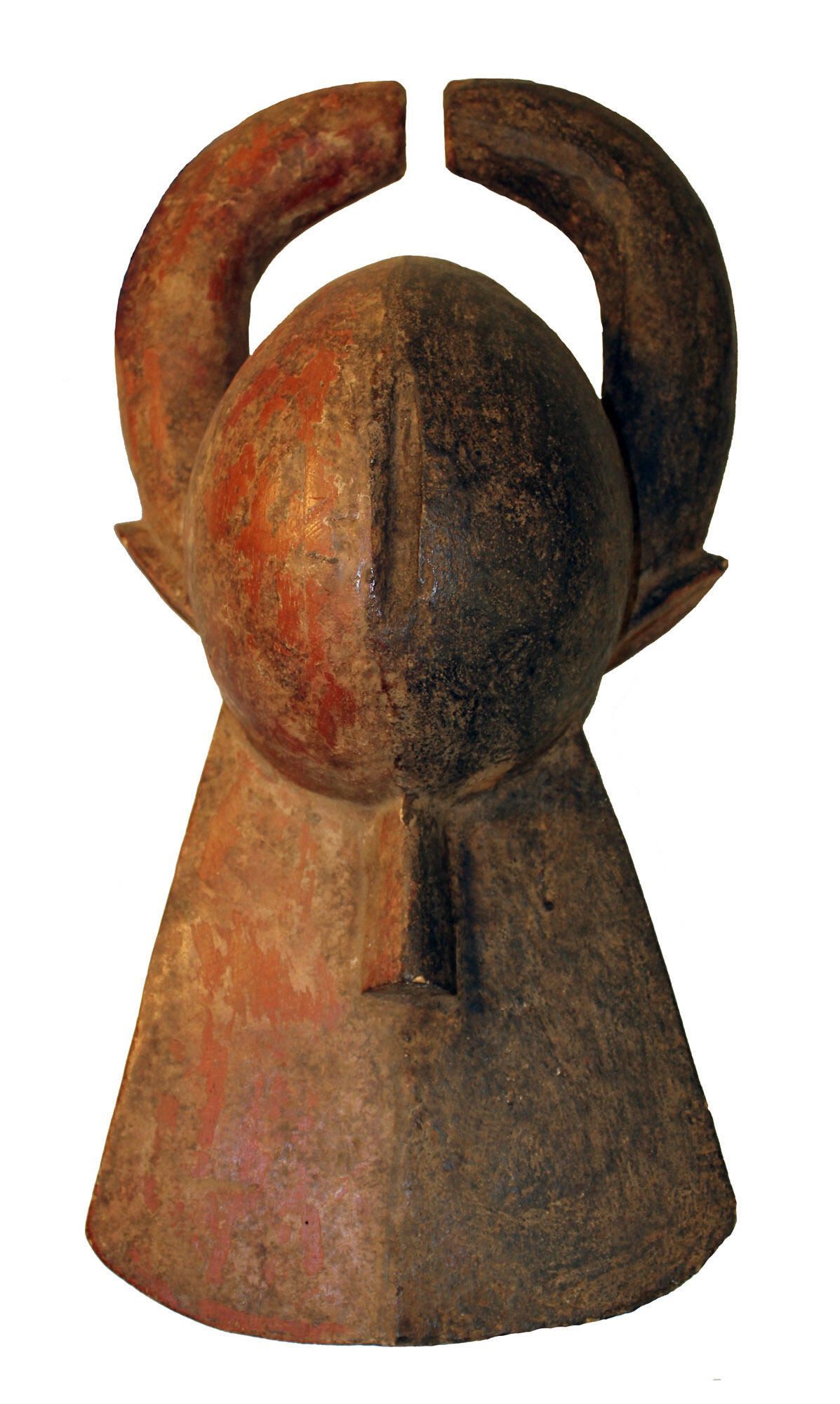 Medium wood mask, divided symmetrically with red and black pigment, with open crocodile jaws and encircled buffalo horns.Context