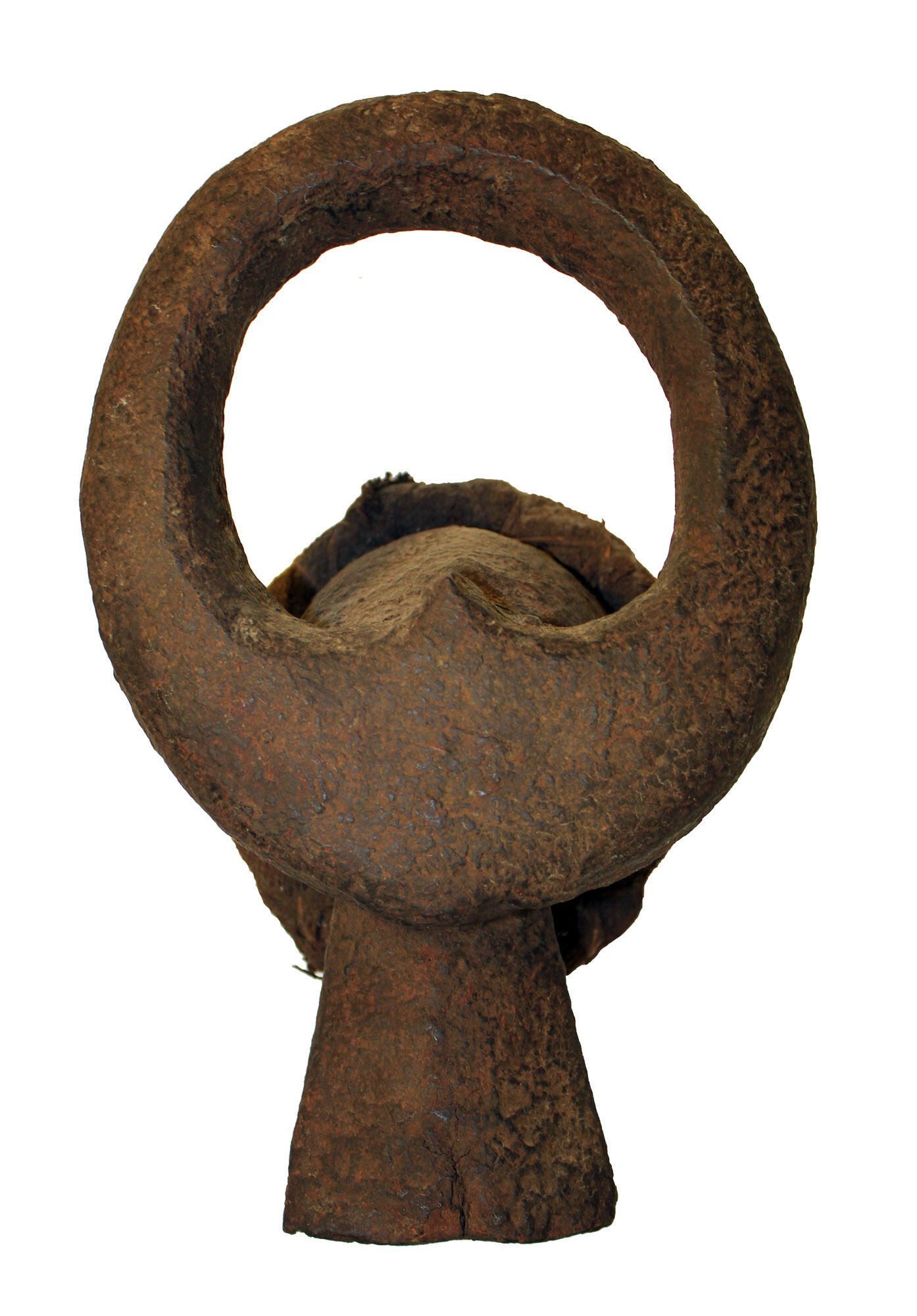 Medium wood mask with open crocodile jaws, completely encircled buffalo horns, and pigment fragments; rolled fabric around the base.Context