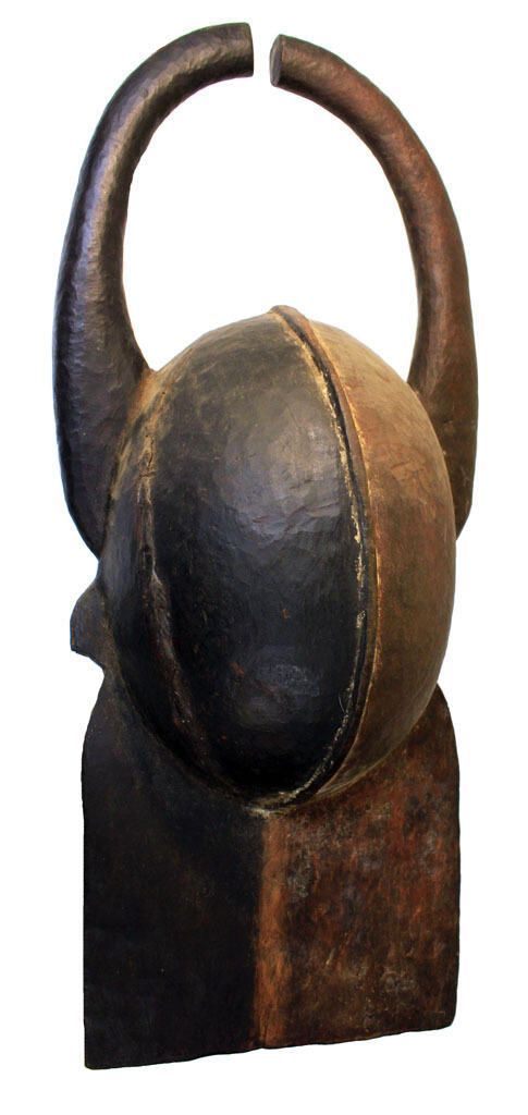 Medium wood mask, divided symmetrically with red and black pigment, with open crocodile jaws and encircled buffalo horns.Context