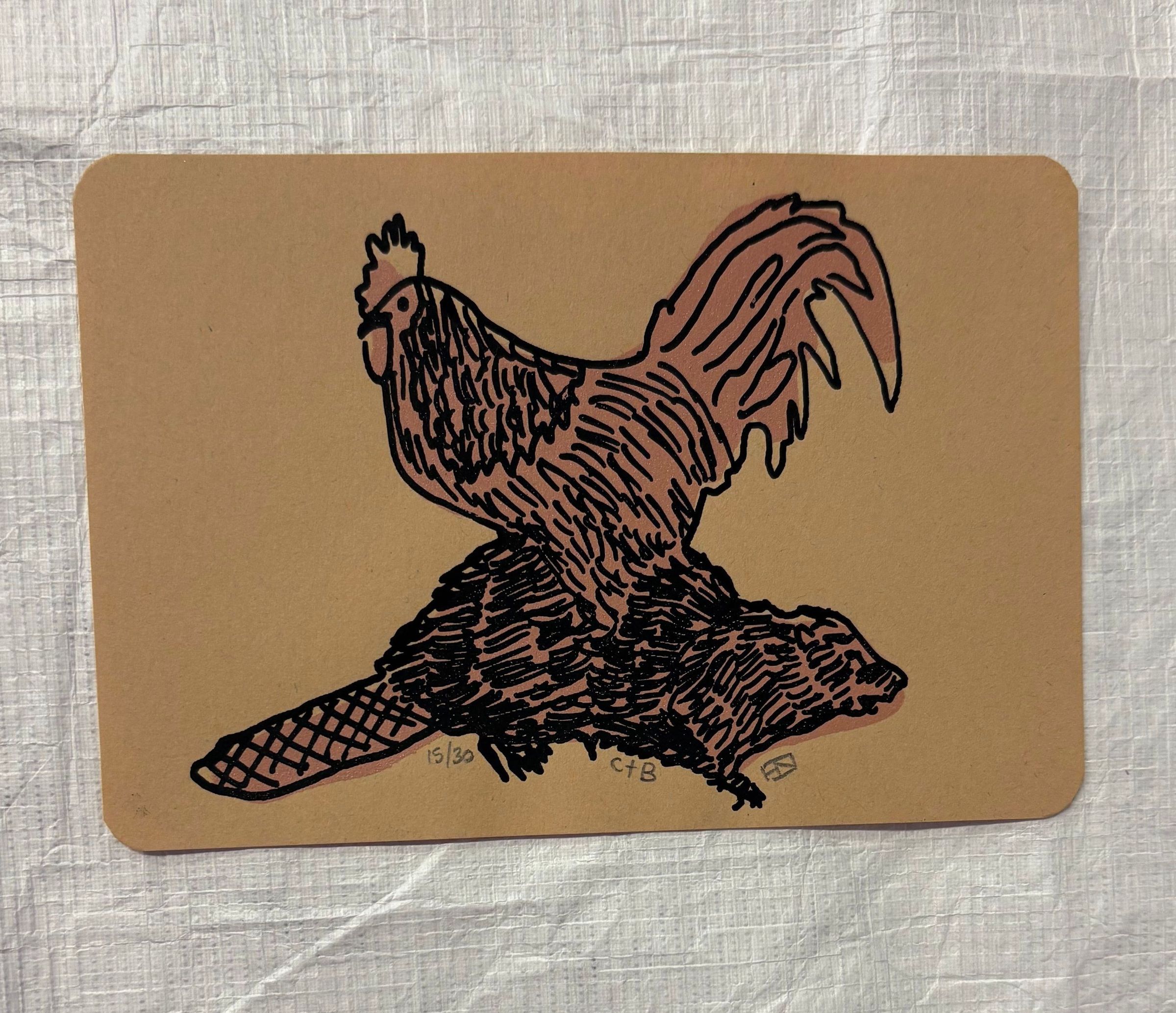 A small horizontally oriented print that utilizes colors such as black, tan, and a brownish-red. At the center of the print is a rooster standing on top of a beaver as if they have some sort of symbiotic relationship.Collection