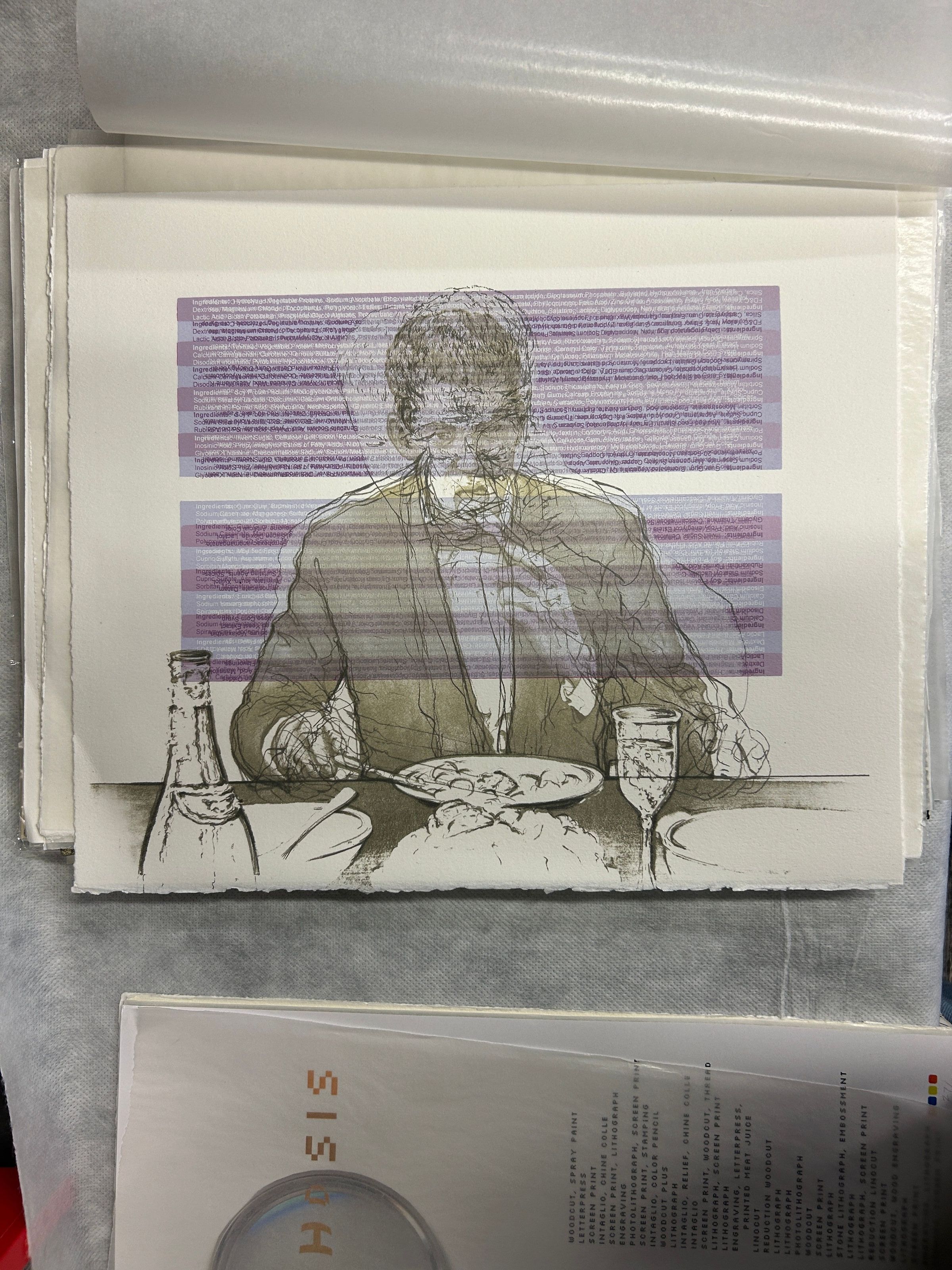 A large, black , purple, and white print of a man sitting down eating a mealCollection
