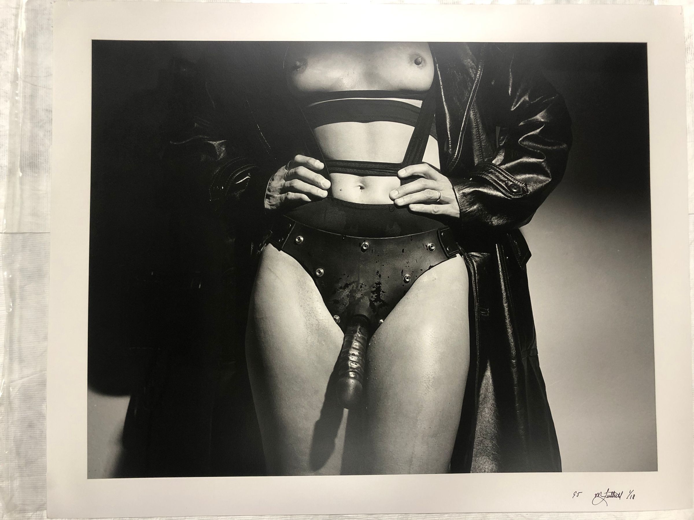 A medium sized photograph in greyscale. Image depicts a semi-nude figure from the bust to the knee, hands on hips, wearing a wedding ring, a long black leather jacket, a braless harness, and a strap-on.Collection