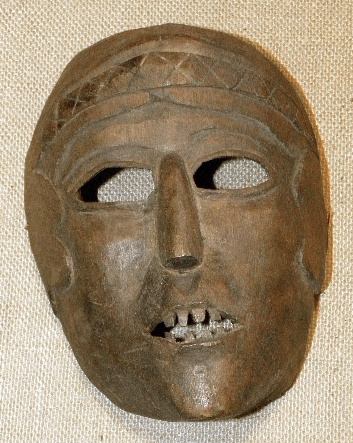 A life-sized circular wood mask depicting a human figure. Carved hair and headband detail on the top of the head. Two cutout eyeholes on either side of a skinny, straight nose. An open mouth with two rows of jagged teeth. A wire is attached to the back of the mask.Context