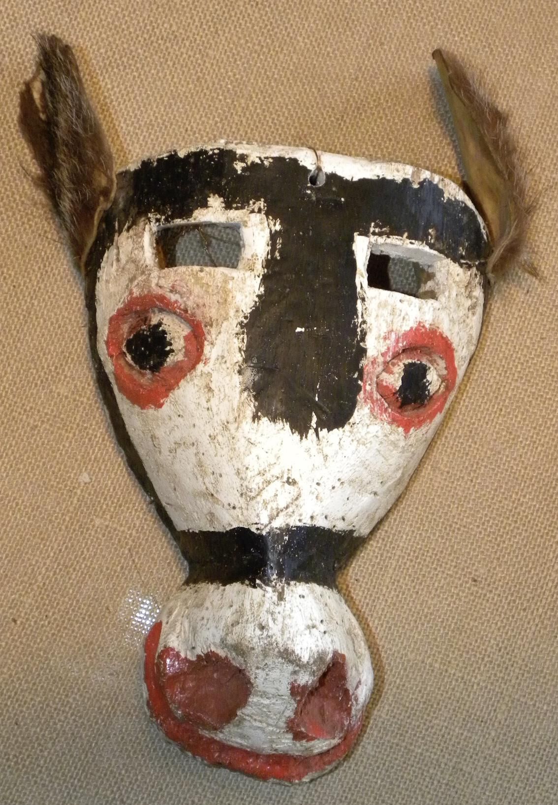 A long hourglass-shaped wood mask depicting a white horse. Animal hide ears are attached to the forehead. Square cutout eyeholes for the wearer are above painted black eyes outlined with red. There is a black bridle painted onto the horse. The muzzle has red nostrils and an open mouth. A wire is attached to the back of the mask. Overall texture and pigment loss.Context